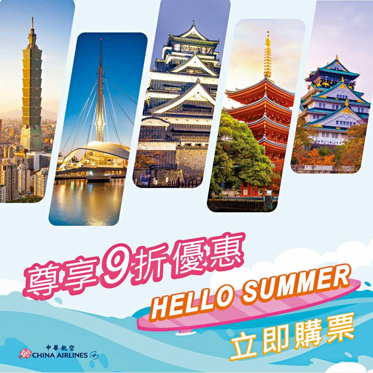 5月20日(下周一)或之前經中華航空官網購買由香港出發至台灣及日本指定航線(單程或來回),票價即享9折起優惠!乘搭經濟艙往來高雄,折後800元起,福岡折後2,700元起等。