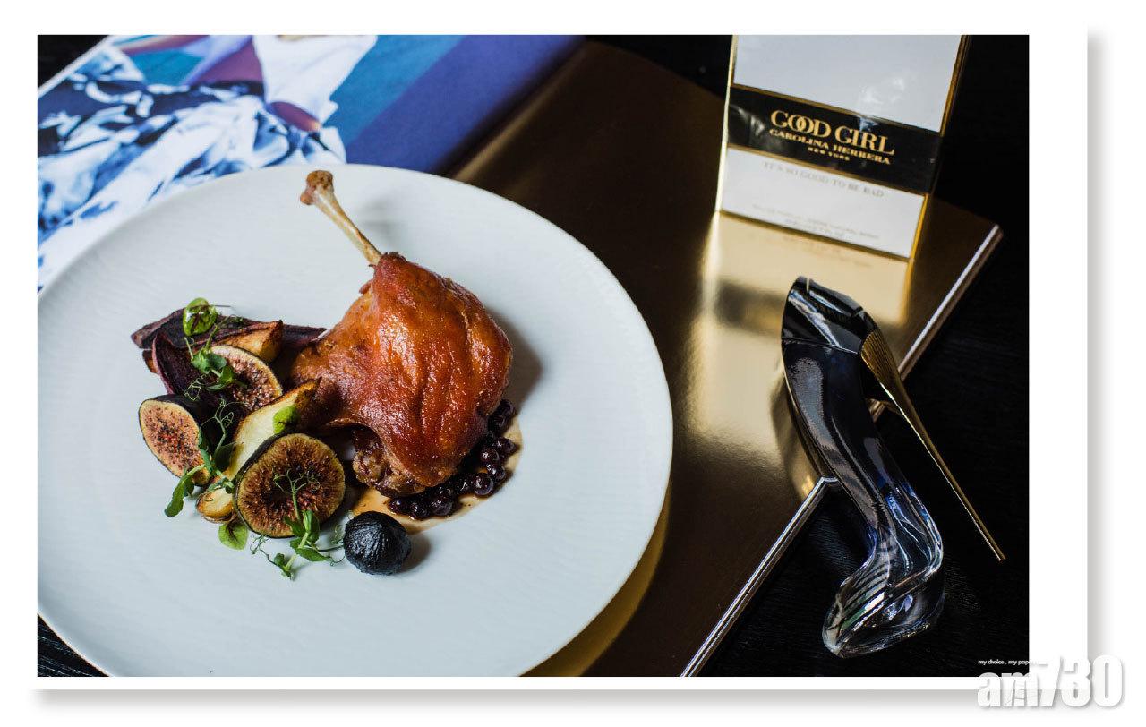 主菜法式油封鴨腿,襯托黑加侖醬汁,相映成趣之餘更能減少肥膩感。