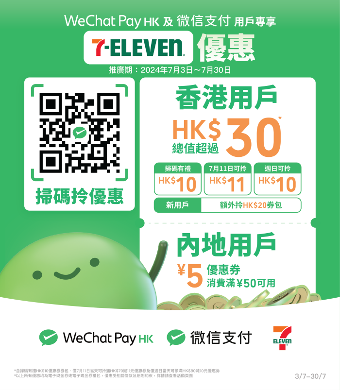 2024711日早上7時起,所有WeChat Pay HK用戶只要使用微信/WeChat掃瞄7-Eleven門店內活動宣傳品二維碼,即可進入專屬活動頁面,並領取一張711HK$11專屬券,當天消費滿HK$70即可使用。