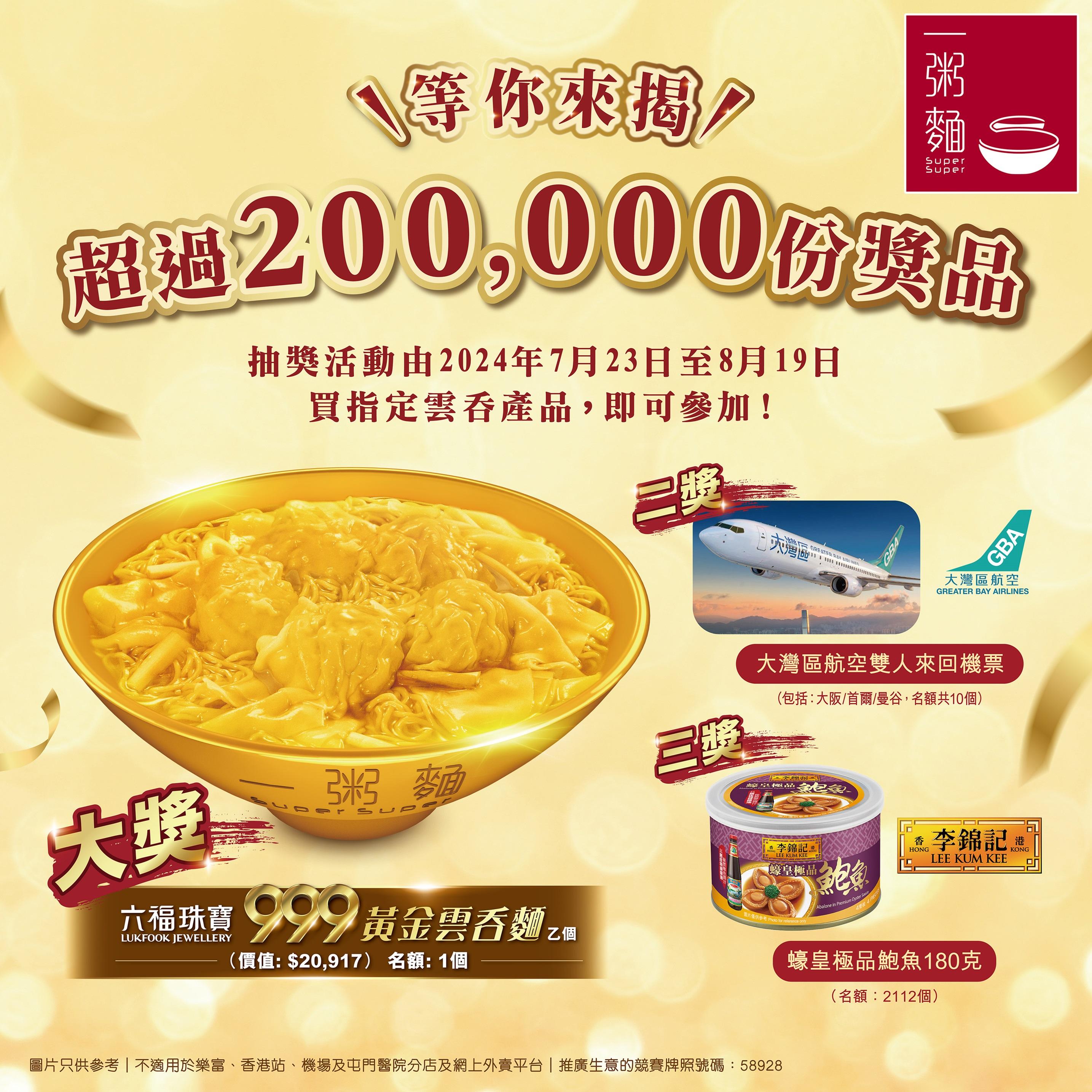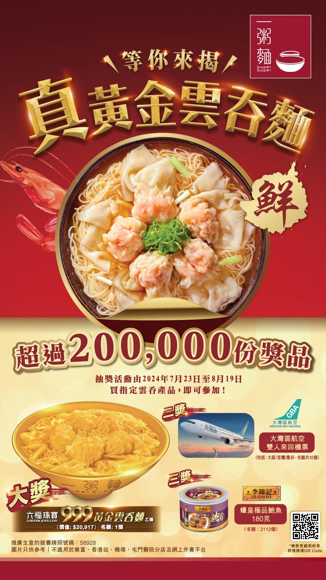 活動獎品:六福珠寶999黃金雲吞麵1個(名額1個;價值HK$20,917)、大灣區航空大阪雙人來回機票(名額2個)、大灣區航空首爾雙人來回機票1套(名額3個)、大灣區航空曼谷雙人來回機票1套(名額5個)、李錦記蠔皇極品鮑魚(180克) 1罐(名額2,112個)、手工鮮蝦雲吞、鮮蝦雲吞麵及其他優惠券等等