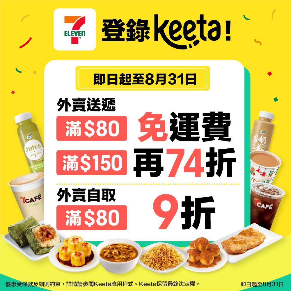 - 在 Keeta 訂購 7-Eleven 外送滿 $80 即享免運費。
