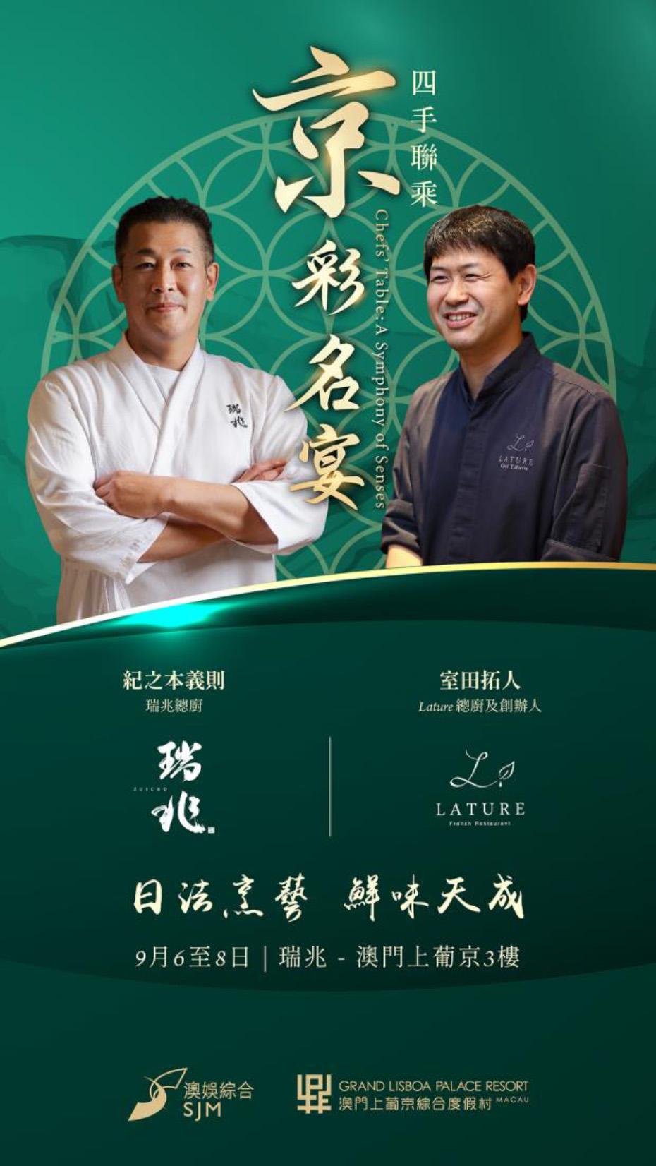 澳門上葡京綜合度假村餐飲系列活動「京」彩名宴,於968日一連三日,邀請東京米芝蓮星級餐廳LATURE(ラチュレ)主理人室田拓人,與高級日本料理餐廳「瑞兆」總廚紀之本義則合作四手聯乘,炮製日法兩地精緻料理。