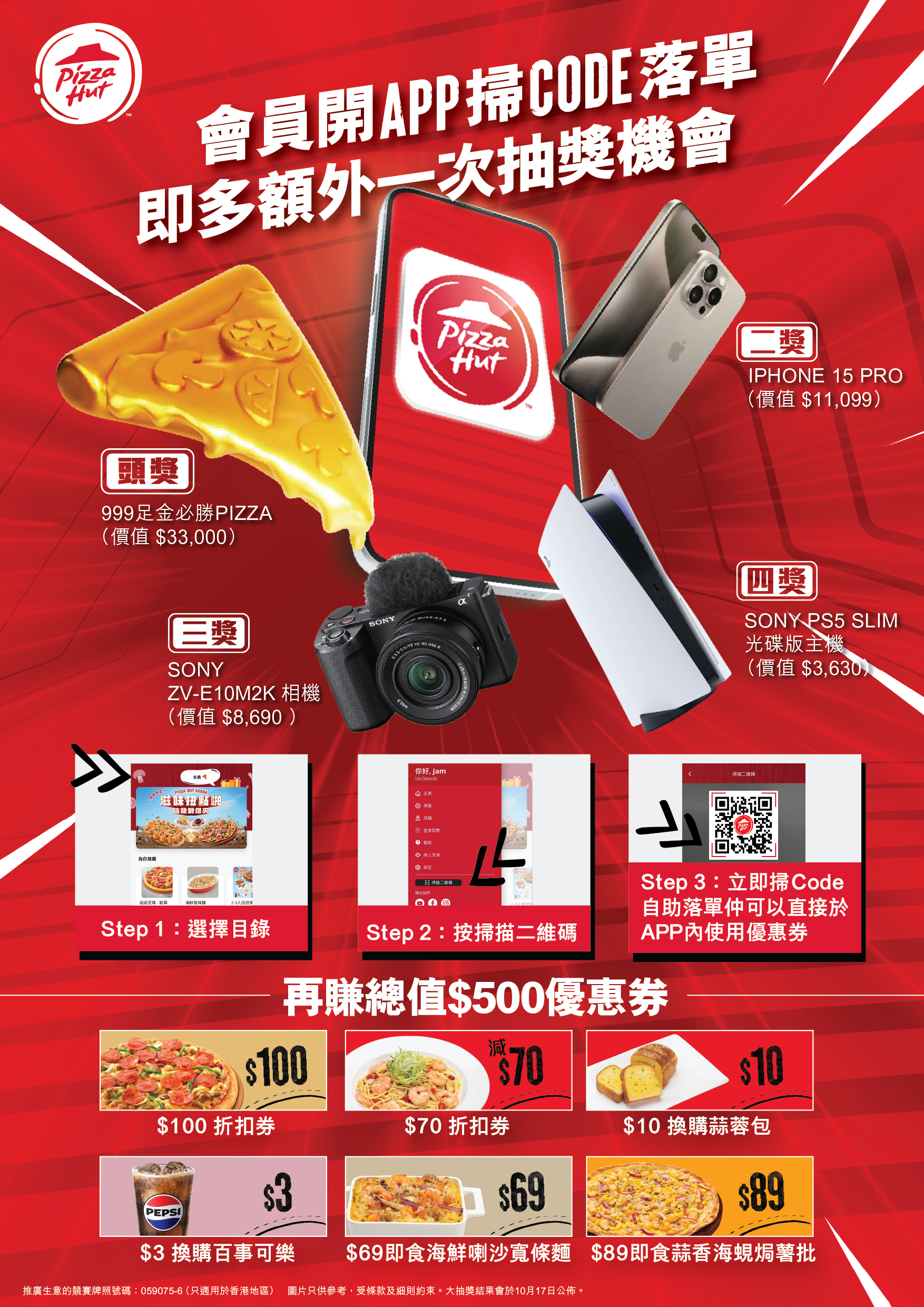 Pizza Hut 手機App功能全面升級,除了增添遙距取票功能外,更可APP內下單,即時使用優惠券。即日起至10月2日前,開APP即可領取總值$500優惠券及參加大抽獎,贏取999足金必勝Pizza、iPhone 15 Pro等!想知詳請即睇內文!