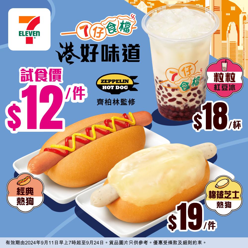 更同步推出限時優惠,大家可以試食價$12購買「7 仔食檔」x「齊柏林」經典熱狗1件。另有棉被芝士熱狗套餐及經典熱狗套餐,由 9 月 11 日起,即可以$34買棉被芝士熱狗套餐1份或$30買經典熱狗套餐1份。