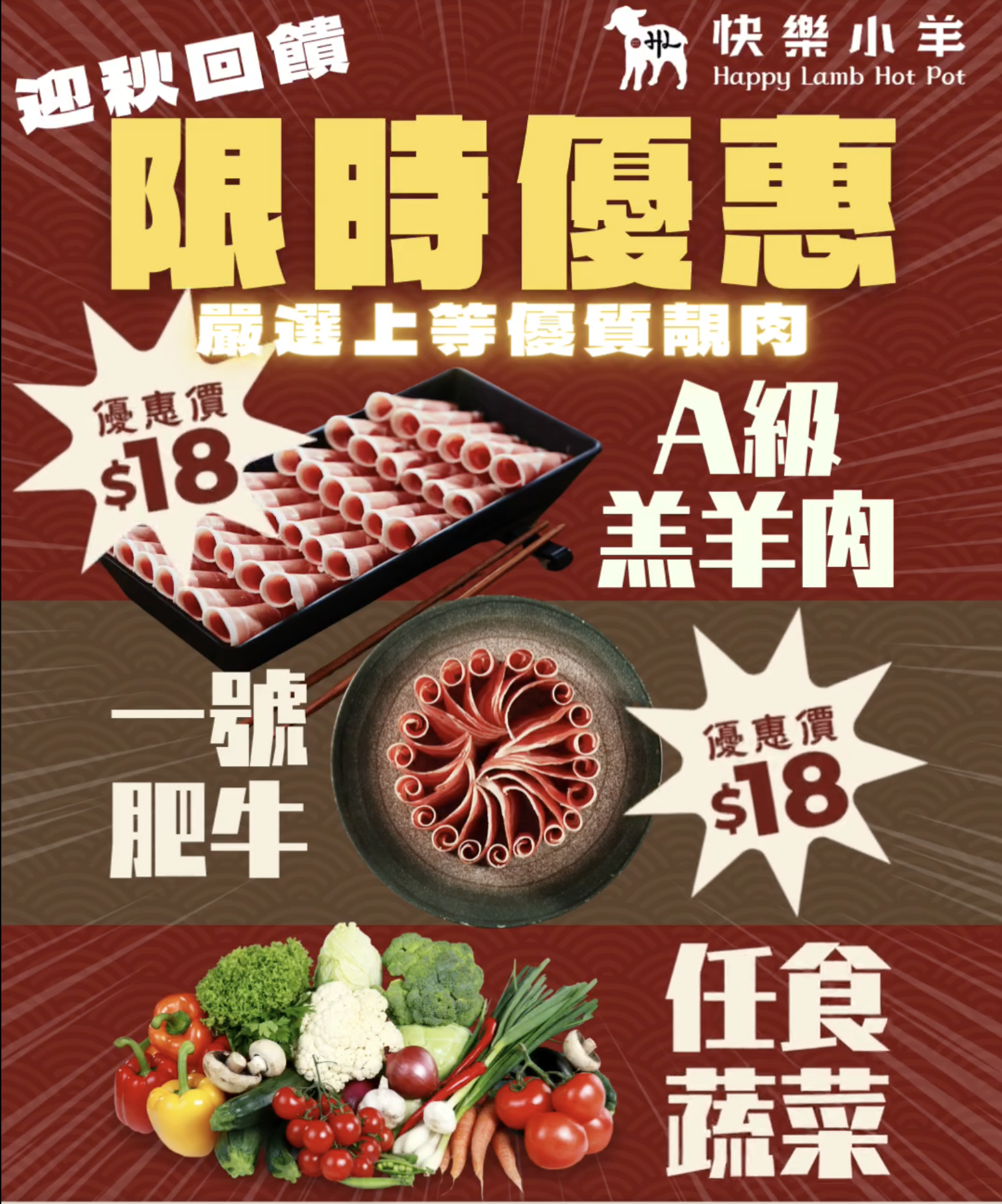 快樂小羊額外再推迎秋優惠,每款劃一$18即可追加極品羔羊肋卷、特級一號肥牛或任食蔬菜吧!$18嚴選上等羔羊,肉質鮮嫩入口即化;125g特級一號肥牛同樣只需$18,口感豐富且香氣四溢的精選靚肥牛; $18優惠更可任食近10款新鮮蔬菜,為你補充滿滿蔬菜纖維!