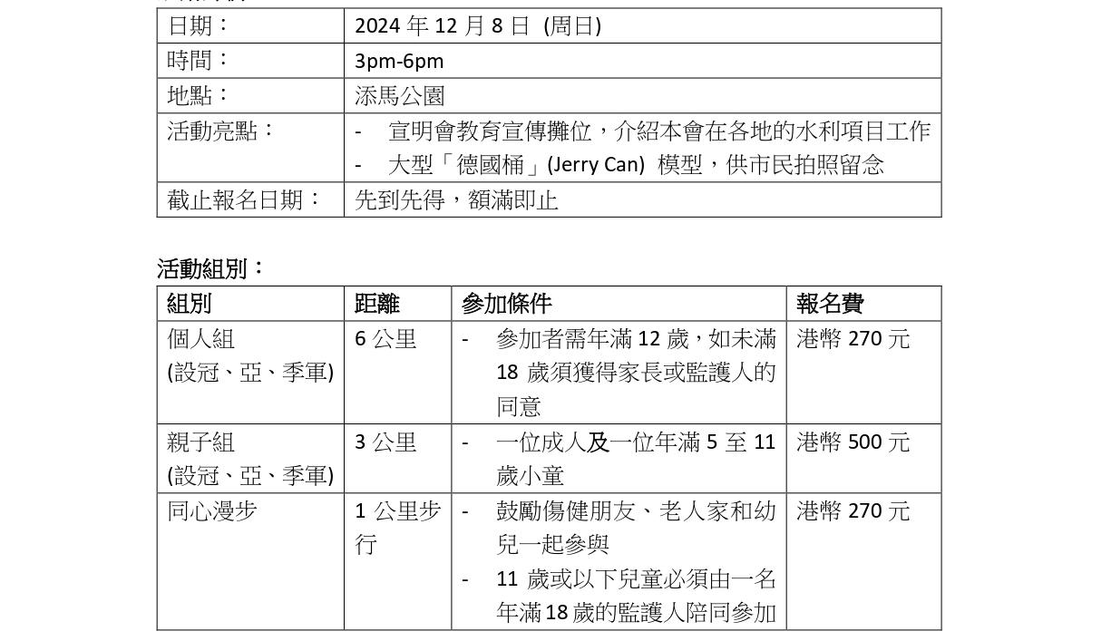 根據世界衛生組織數字,全球有22億人缺乏清潔食水。飲用不潔食水可能患上腹瀉等水傳播疾病。有見及此,宣明會首度在香港舉辦「Global 6K for Water」跑步或步行活動,為缺乏清潔食水的非洲地區籌款,改善當地水利設施。活動設3公里親子組别,家長不妨帶同小朋友一同關注食水不潔問題。
