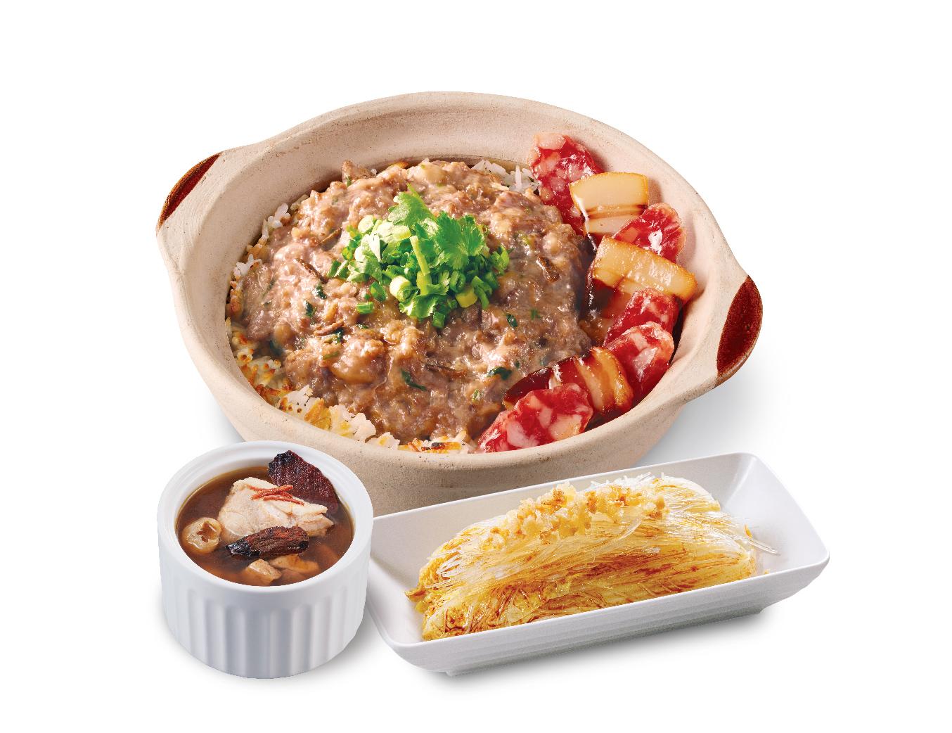 除了經典配搭,今年亦特別新增臘味片陳皮牛肉餅煲仔飯及臘味片蝦醬蝦乾豬頸肉煲仔飯,同樣足料惹味!臘味片陳皮牛肉餅煲仔飯選用鹹香惹味的精選臘肉、臘腸片,香氣十足,加上用10年日曬靚陳皮、爽脆馬蹄製成的牛肉餅,牛餅厚身多汁,入口清香,食後更可嚐到陳皮的回甘餘韻,傳統美味。而臘味片蝦醬蝦乾豬頸肉煲仔飯則是心水推介,除了選用精選臘肉、臘腸片,亦加入以蝦醬醃製的豬頸肉,再搭配鮮味十足的蝦乾,滿滿鹹香鮮味。