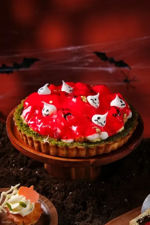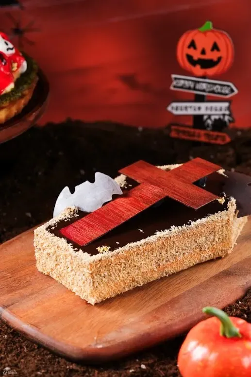 想要更多驚喜和刺激,不妨嘗試一下「肉眼球血汁意粉」,以其獨特的外觀和美味的口感,定能讓你大呼過癮。特別造型的甜點亦是不可錯過!「棺材歌劇院蛋糕」和「幽靈蛋白餅」不僅造型別緻,味道也同樣出色,享用精神準備的晚餐,為萬聖節之夜畫上完美的句號。