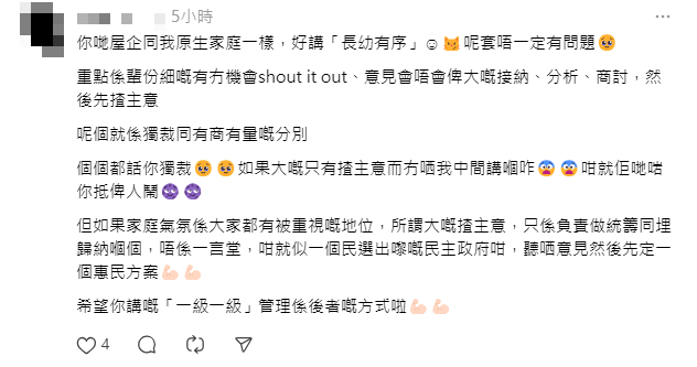 該五孩母在社交平台Threads發文,分享自己的小朋友相處和樂,不會出現鬥爭。方法就是讓年紀最大的小朋友揸主意,由上級管理下級,而其他弟妹因自出生以來都是按照此方法教養,所以弟妹不會有任何意見。她舉例,會先讓年紀最大的小朋友上車後先選擇座位,年紀最小的對此就不會有意見。