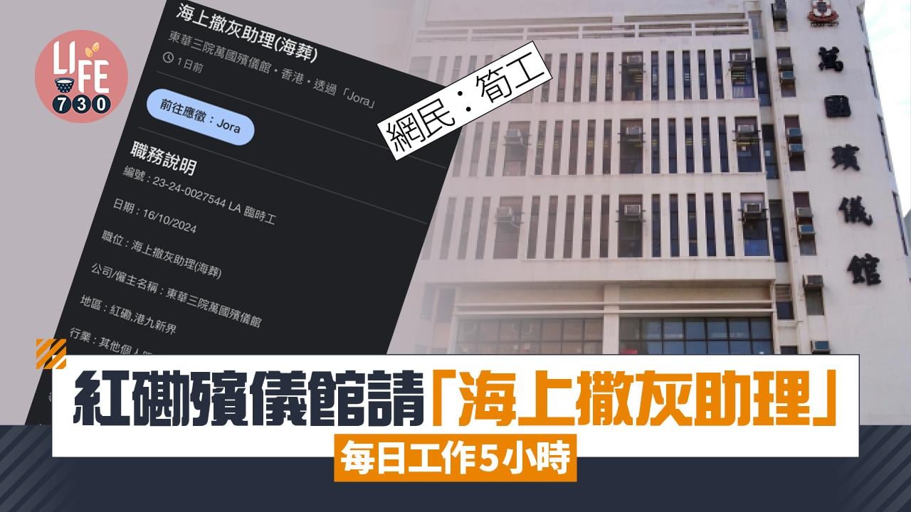 殯儀行業性質特別,較少公開招聘。但近日東華三院紅磡殯儀館居然公開請「海上撒灰助理(海葬)」,工作期至25年3月31日,吸引不少網民關注。有網民表示,工作屬筍工;亦有網民認為比想象中低人工。