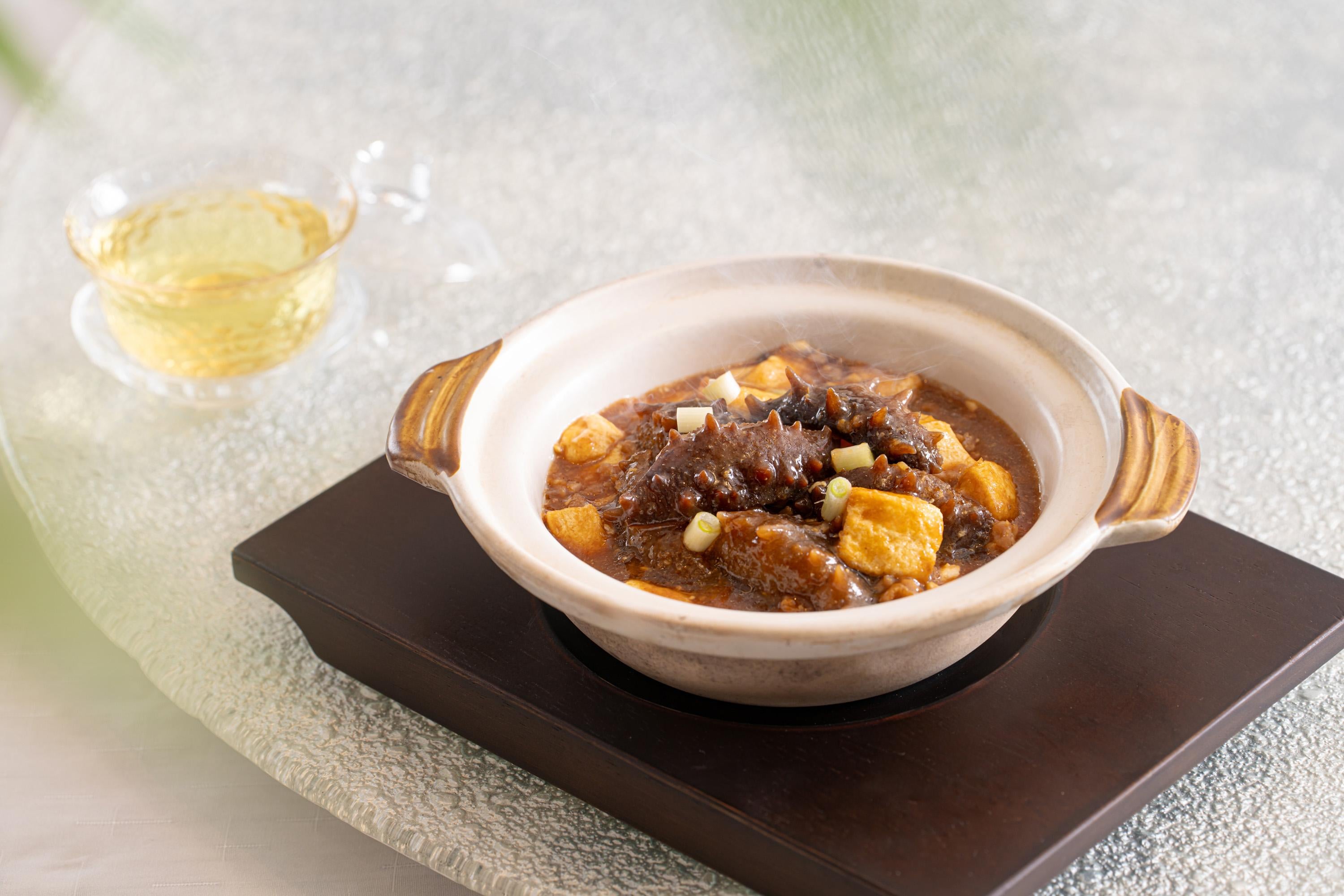 當中必試本地龍蝦麻婆豆腐($438),選用新鮮本地青龍蝦配搭經典麻婆豆腐,醇厚的豆瓣醬與微辣的調味料相互交融,打造出獨特的粵式風味。鮮爽的龍蝦肉,以少許花椒油炒香,讓麻婆豆婆添上一抹誘人的麻香。關東刺參馬友豆腐煲($698)則用料矜貴,以日本關東刺參配豆腐紅燒,加入少許梅香馬友鹹魚昇華味道,鮮美鹹香,絕對是冬日必食的煲仔小菜。還有極巧刀工的琥珀千葉豆腐($258),廚師將公和荳品廠出品的招牌滑嫩豆腐,巧手細切成2毫米厚度的薄片,並精心盤於碟中,搭配炒香的雞頭米、萵筍粒、馬蹄粒、榆耳以及羊肚菌等素食材料,綴以香脆琥珀合桃,精緻而美味。最後甜品則有燕窩豆腐奶凍($88),以豆香清冽的無糖淡豆漿配忌廉製成的豆腐奶凍,綴以燕窩和金箔,香甜幼滑,完美為「豆韻飄香」嚐味菜單作結。