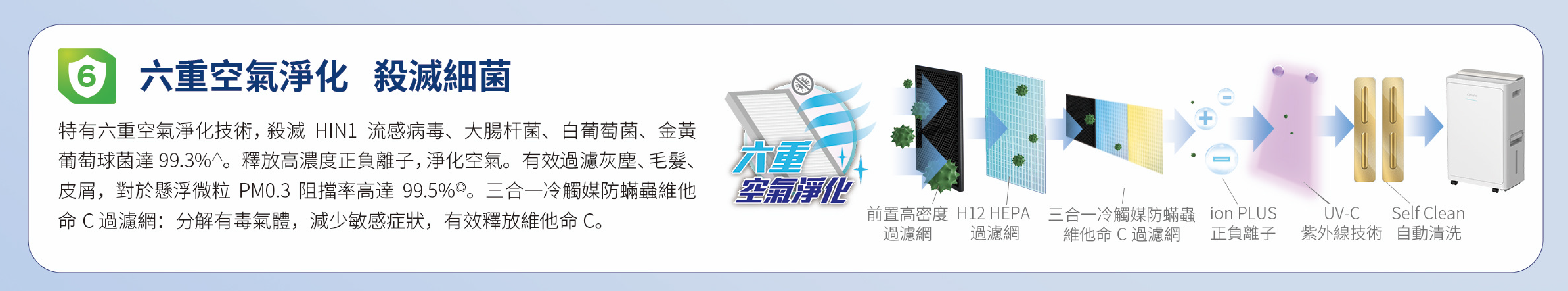 濕氣不只是讓家裡感覺悶焗,衣服發霉,更會讓細菌瘋狂滋生,容易引起過敏和呼吸道問題。DC-22VS/VSB同時擁有高效空氣淨化功能,且能單獨啟動淨化模式,並搭載六重空氣淨化技術,無需額外購買「HEPA」過濾器進行加裝。
