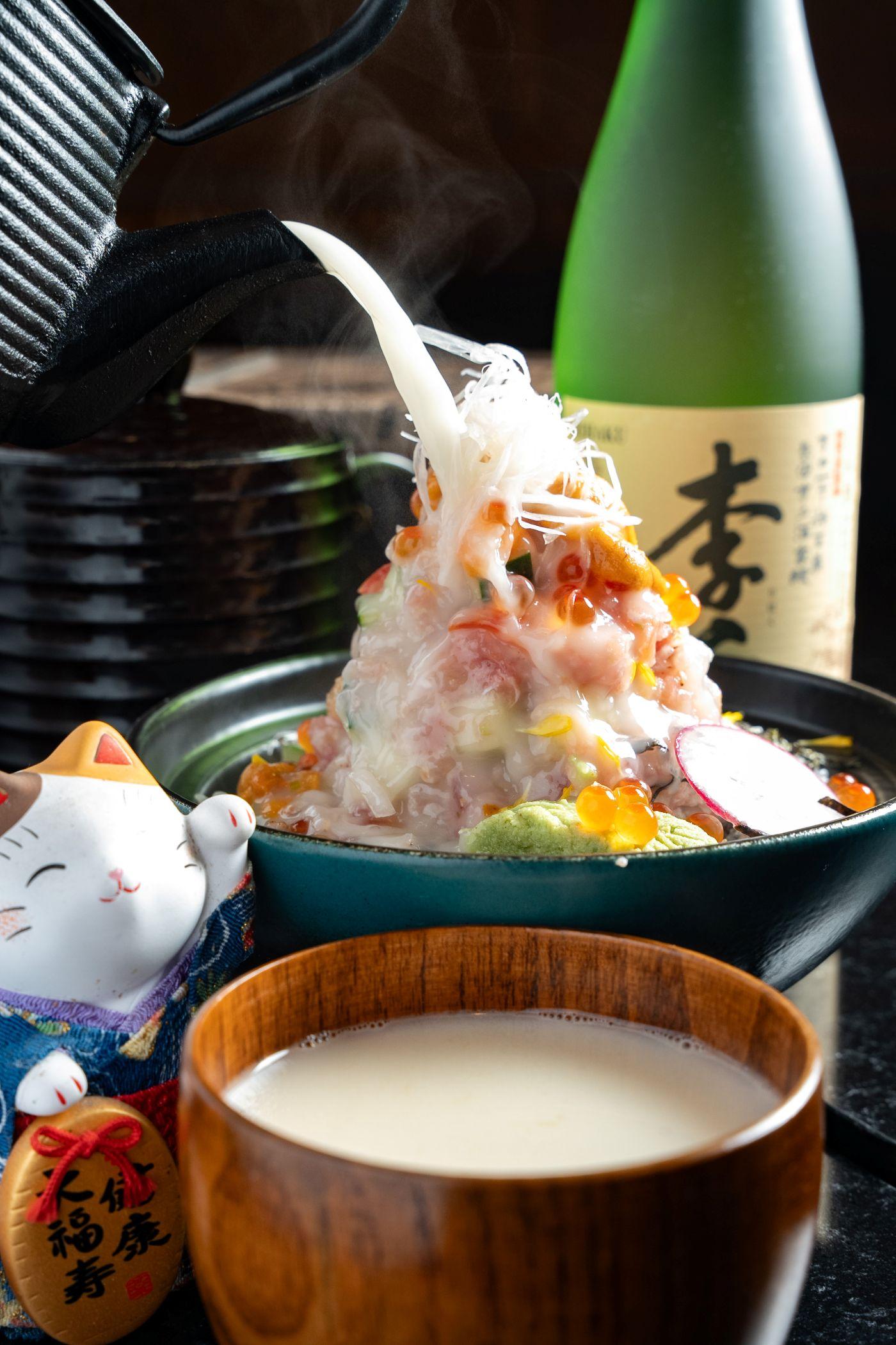 新菜式必食特上三文魚蓋飯,吞拿魚腩碎經過炙燒,油香四溢,搭配新鮮的帆立貝、吞拿魚、八爪魚和北寄貝。大家可追加北海道海膽及松葉蟹肉,滿口海洋氣息。這蓋飯附上熱騰騰的香濃奶白鯛魚湯,加上清新的鮮柚子皮和大葱,令鮮甜味更昇華。刺身定食有齊三文魚、中吞拿魚腩、油甘魚、珍寶赤蝦、真鯛、北寄貝,組合豐富。