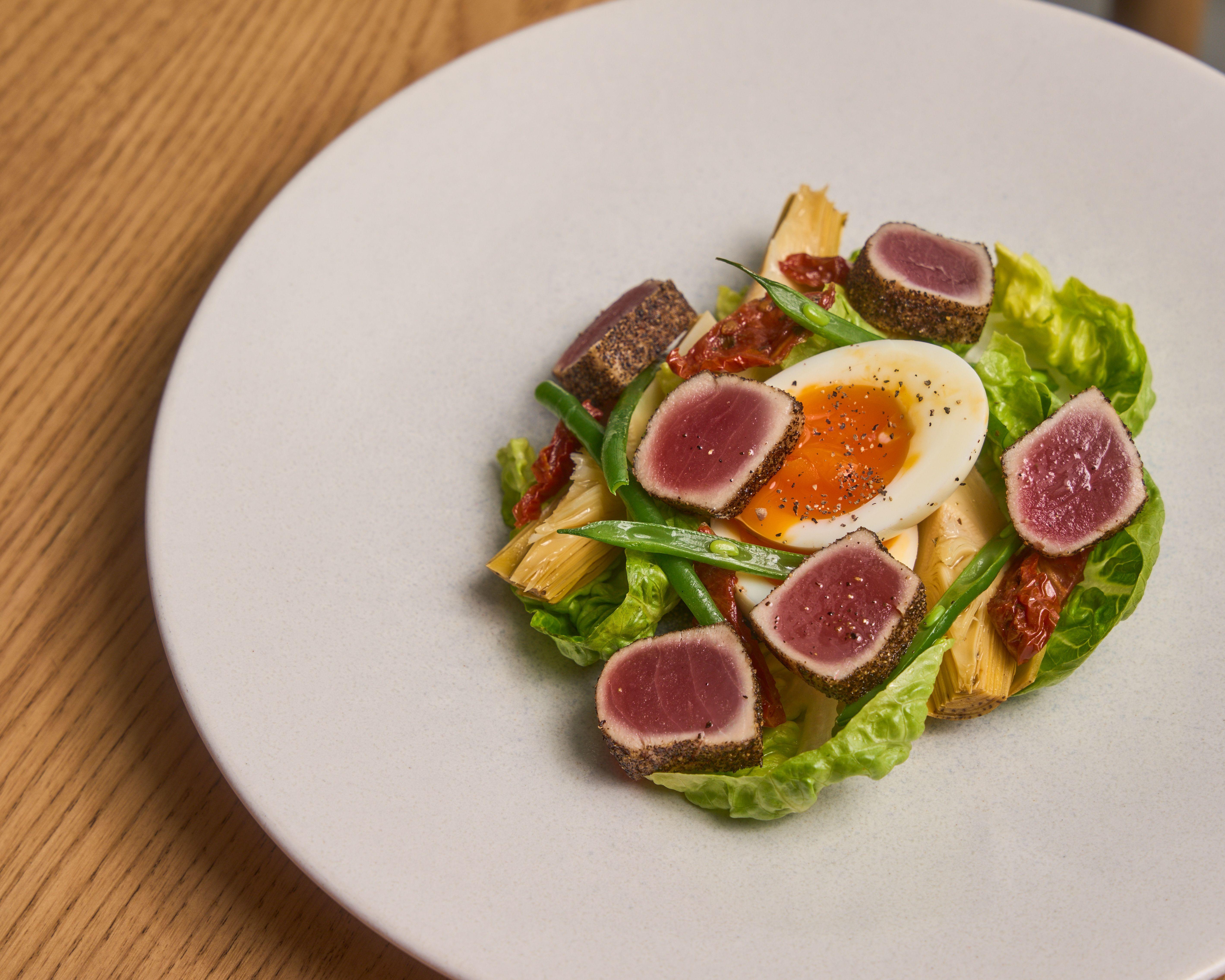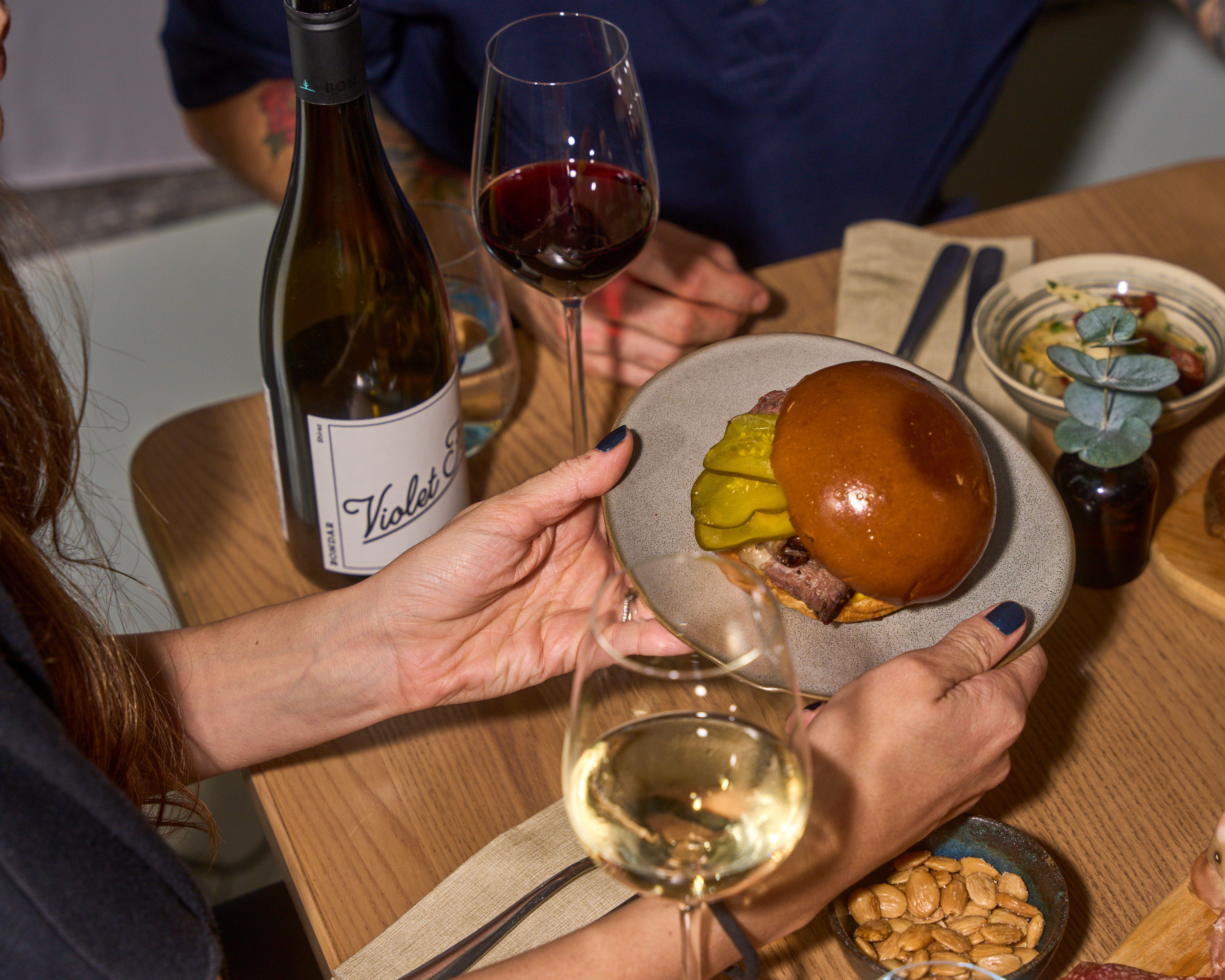 午餐時段,餐廳則有一系列濃郁鮮味菜餚,包括手工酥皮豬肉卷配五香番茄醬,外皮金黃酥脆,內餡濃郁多汁;尼斯沙律配黃鰭吞拿魚、溏心蛋與豆角,選用時令食材,新鮮滋味與營養價值兼備;照燒汁薄切和牛薯仔沙律加入烤紅菜頭增添獨特風味。晚市亦有驚喜,提供多款佐酒小食,如精選火腿芝士拼盤搭配醃菜、葡萄與脆餅等,亦有人氣澳洲和牛牛腩包,以酸黃瓜與香辣芥未蛋黃醬作餡料,微酸開胃,巧妙地平衡肥膩感,值得一試!