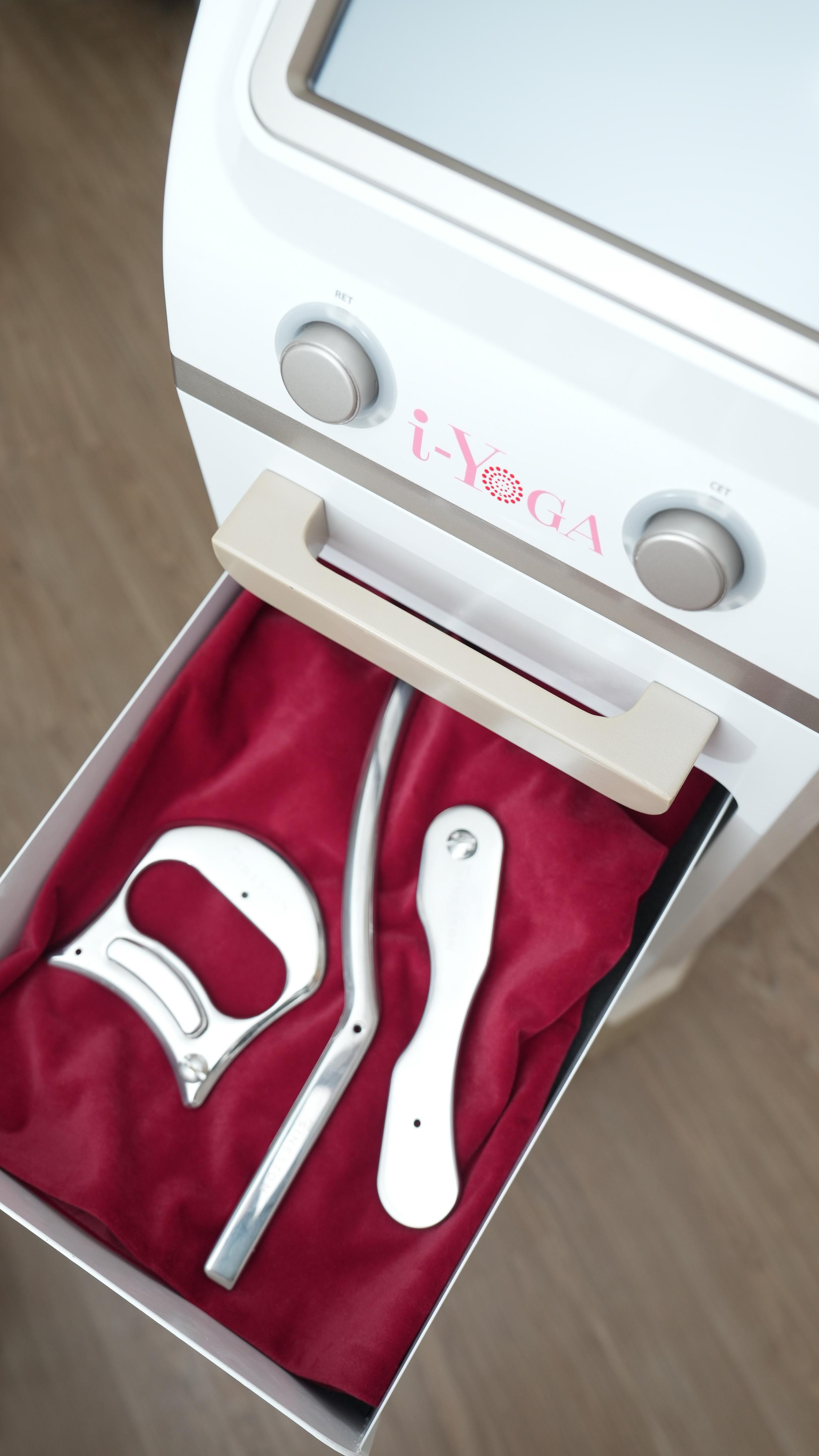 i-YOGA兩款「電波撥筋小顏刀」及「熱磁筋膜刀」,結合中醫淋巴通絡及撥筋刮痧、西方射頻熱療、印度高溫瑜伽、醫學生物科技、物理量子共震5大技術,將電波、按摩、熱療、舒筋、運動合而為一,喚醒肌膚細胞。
