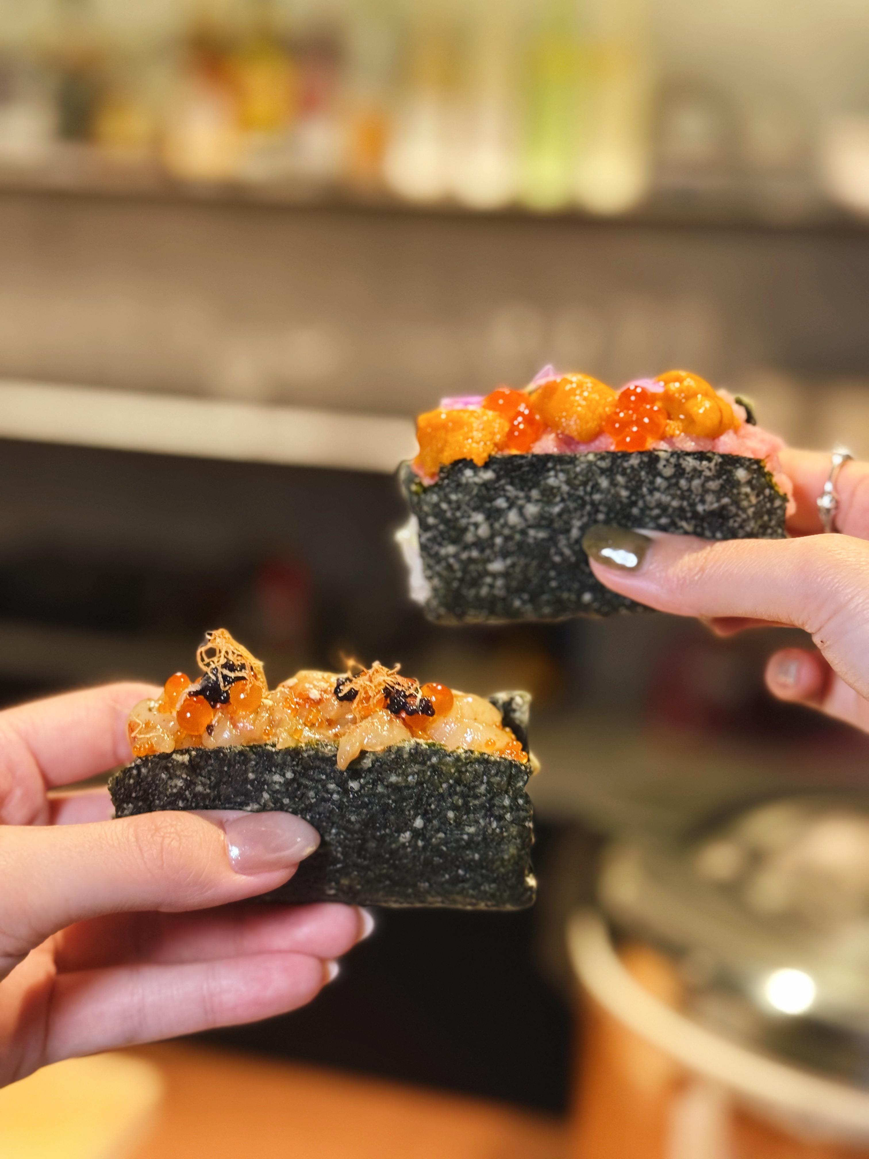 記者當日試了多道招牌菜式,單是開胃前菜無花果烤水蜜桃配水牛芝士($118)就被成功俘虜胃部,店家以燒至微焦的蜜桃,配搭自家鹽漬櫻花、梅酒製成的油醋汁,綴以番石榴及香料煮至濃稠的醬汁,酸甜清新,令人食慾大增。而紅蝦紫菜夾餅($108)亦是必試,廚師將赤蝦的蝦頭膏熬成醬汁,並自家製成蝦油,再撒上自家用赤蝦製成的蝦鹽,一口咬下既有紫菜夾餅的香脆口感,亦有蝦肉的鹹香惹味。主菜方面,心水是甘苔紫菜包飯($368),看似經典食材組合,但入口絕對有驚喜!飯底為韓式麻油紫菜飯,再在表面舖滿三文魚籽、海膽、拖羅及魚子醬,鮮味之餘麻油飯底香氣滿溢,再配搭韓國甘苔紫菜包裹享用,讓整道菜式錦上添花。