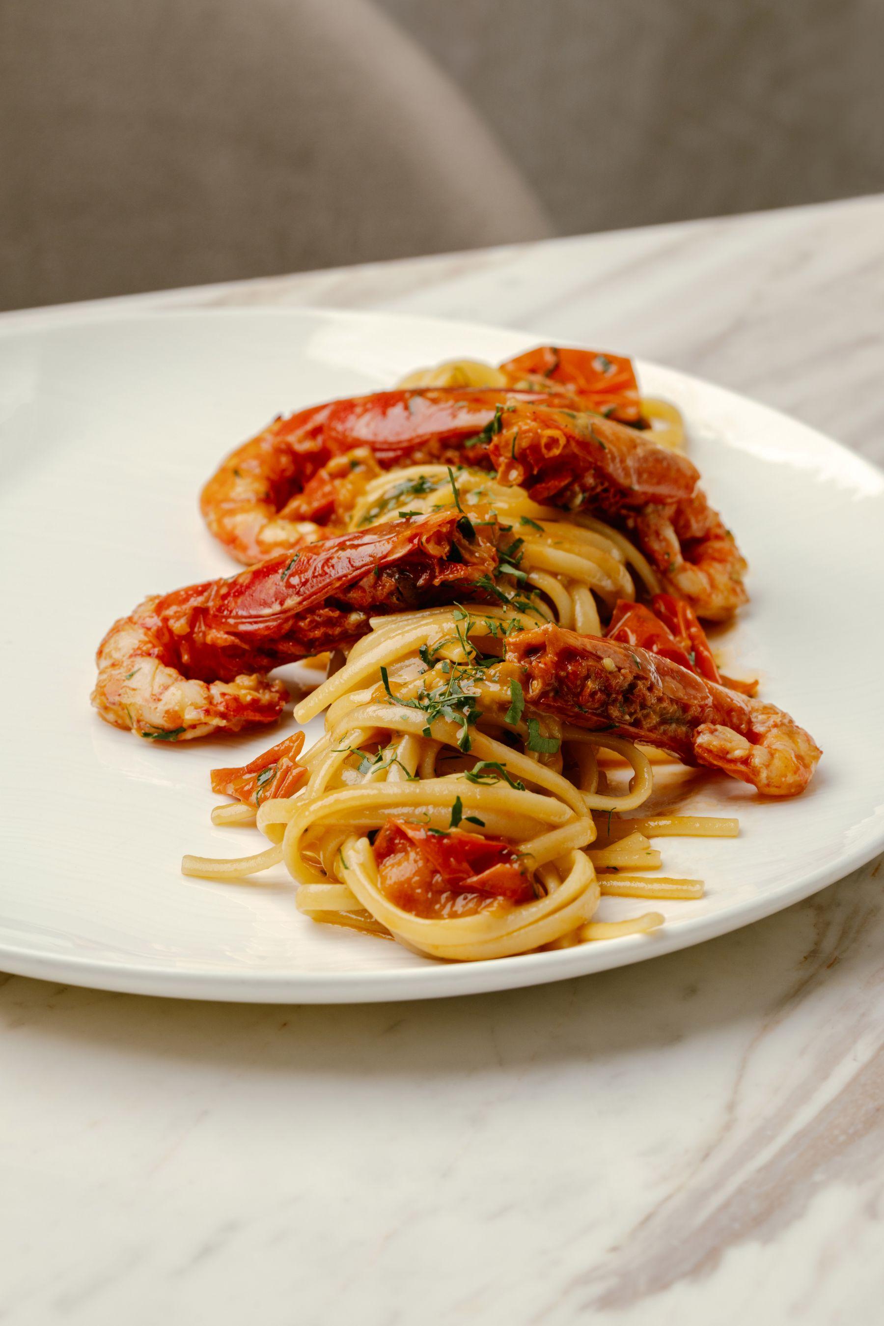 意粉控一場來到就要試試Chris拿手的招牌菜西西里紅蝦扁意粉,是他多年前在著名意大利餐廳da Domenico跟意大利大廚學習再累積經驗得來的。他嚴選了意大利西西里島馳名的紅蝦,按壓蝦頭提取蝦膏作蝦汁,帶有地中海的海洋精華,與濃甜的意大利車厘茄,拼湊出誘惑的蝦香。而意大利直送的彈牙扁意粉,均勻掛附濃郁的紅蝦精華,每條扁意粉都香口滋味。主菜燒美國和牛伴菊苣、焦糖化布冧、蘋果及布冧蓉也好吃,牛肉富有油香及肉香,肉質相當柔嫩腍滑,布冧的果香與甜酸中和了油膩感。