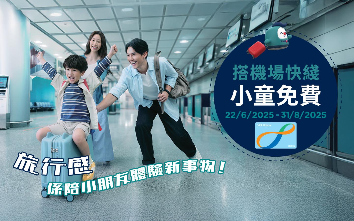 小童免費乘車:由即日起至2025年8月31日,3至11歲的小朋友只需使用有效的小童八達通,即可免費乘搭機場快綫往返市區車站(香港、九龍或青衣站)及機場站。