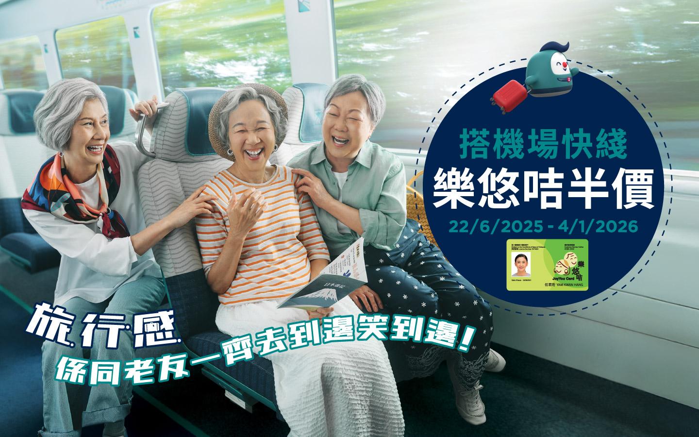 樂悠咭半價優惠:由即日起至2026年1月4日,60歲或以上的樂悠咭持有人使用有效的樂悠咭,亦可享八達通車費半價優惠乘搭機場快綫往返市區車站(香港、九龍或青衣站)及機場站,與兒孫老友外遊共度珍貴時光。
