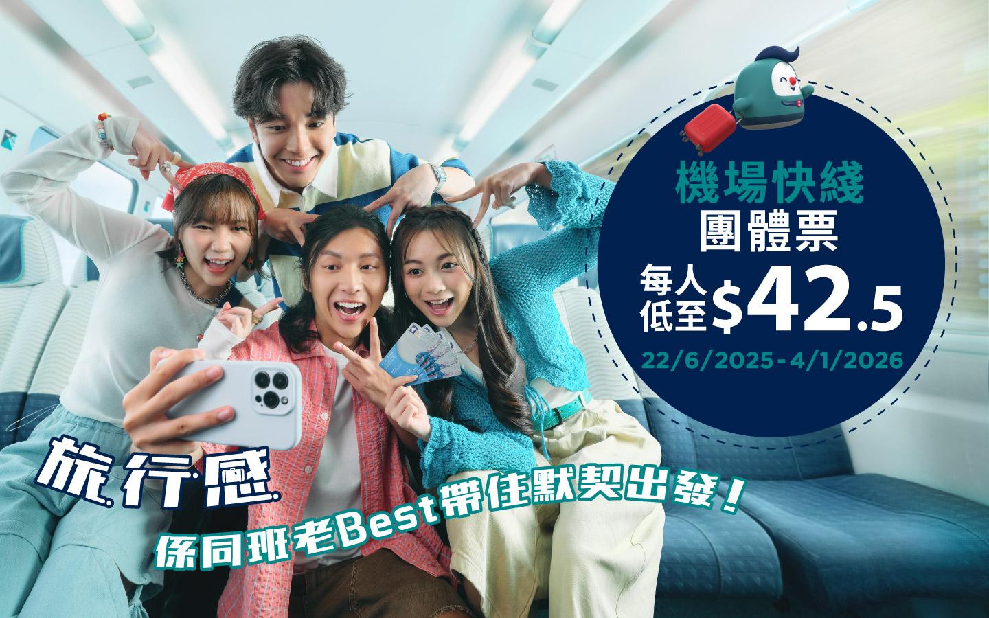 團體票每人低至$42.5:由即日起至2026年1月4日,無論是2人、3人或4人同行,只需⼀同前往機場快綫客務中⼼(博覽館站除外)購買單程團體票,即可以每人低至$42.5的優惠價乘搭機場快綫往/返機場站。