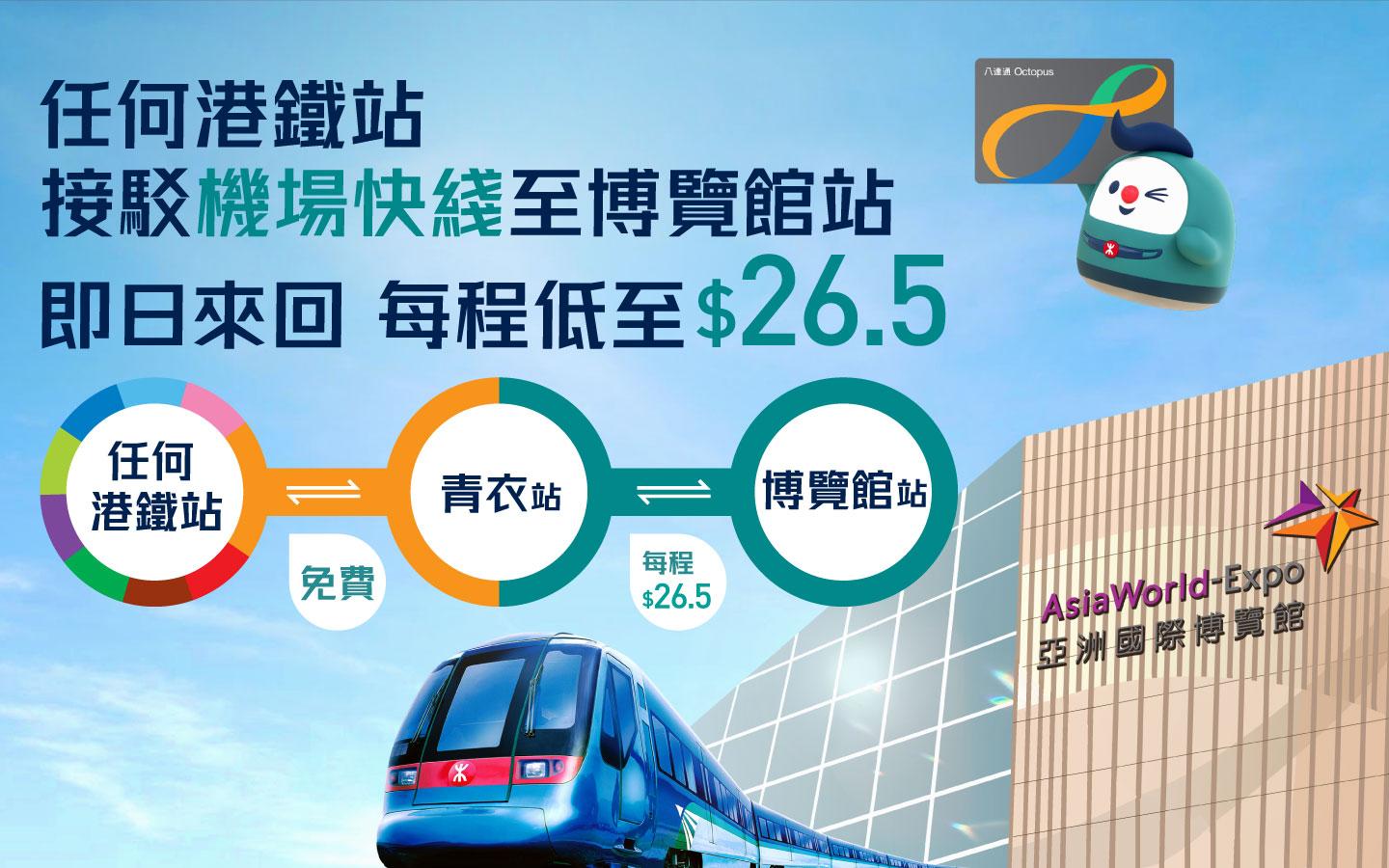輕鬆快捷來回亞博:只需使用同一張八達通即日往返市區車站(香港、九龍或青衣站)及博覽館站,並於亞博館逗留1小時或以上(以博覽館站出閘至回程入閘時間計算),即可以低至$53的優惠價乘搭機場快綫。同時,乘客仍可享免費港鐵接駁服務,以每程低至$26.5即日往返任何港鐵站及博覽館站。