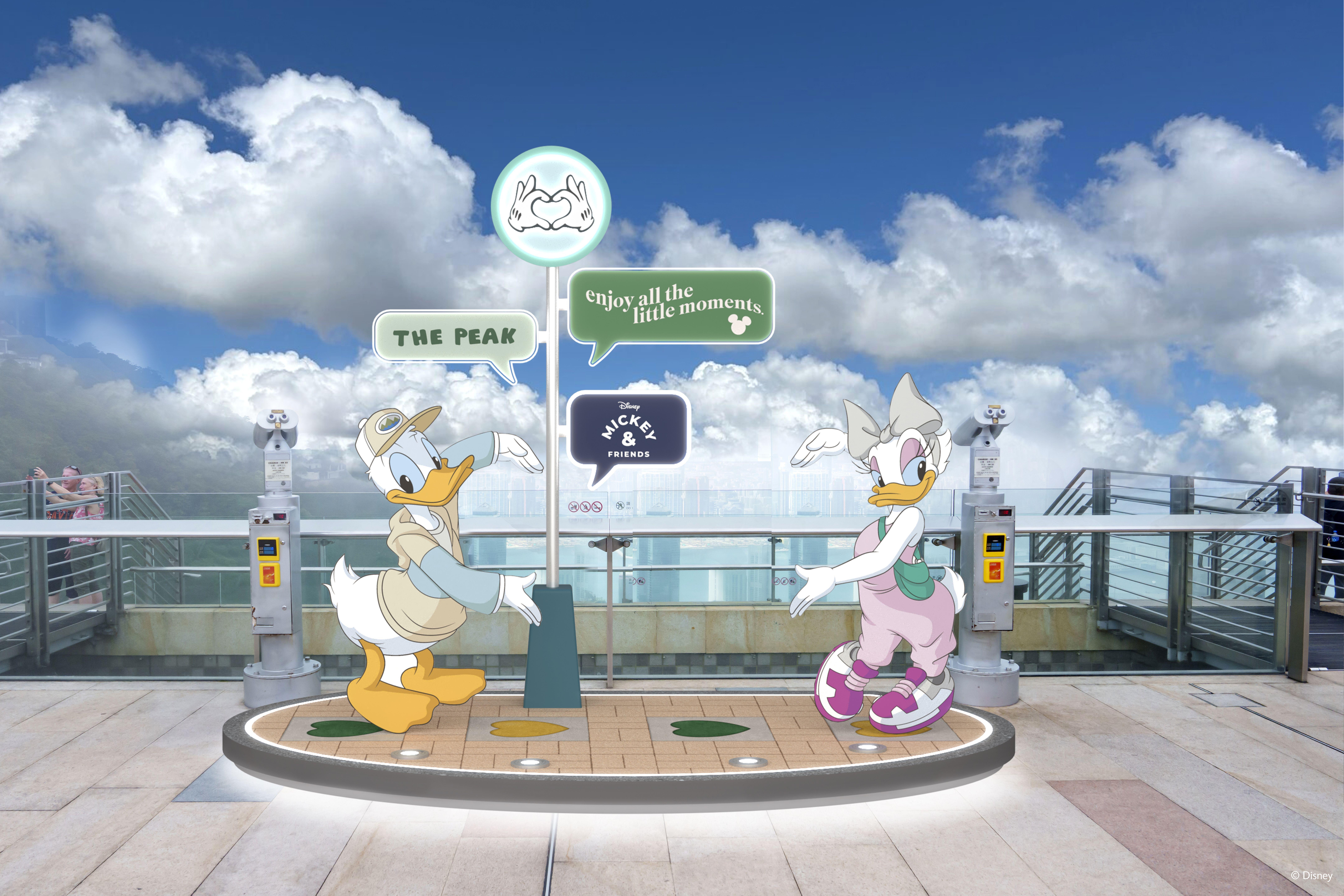 一眾迪士尼人氣角色米奇、米妮、唐老鴨、黛絲、高飛、布魯托、鋼牙與大鼻將於6月26日起登陸香港著名地標太平山頂,帶給粉絲及遊客驚喜。米奇與好友將在凌霄閣及山頂各處出沒,粉絲不妨集齊所有角色與自己的合照,將難忘瞬間定格。在山頂纜車中環總站及車廂內,唐老鴨與一眾米奇與好友將會擺出各種甫士歡迎訪客。