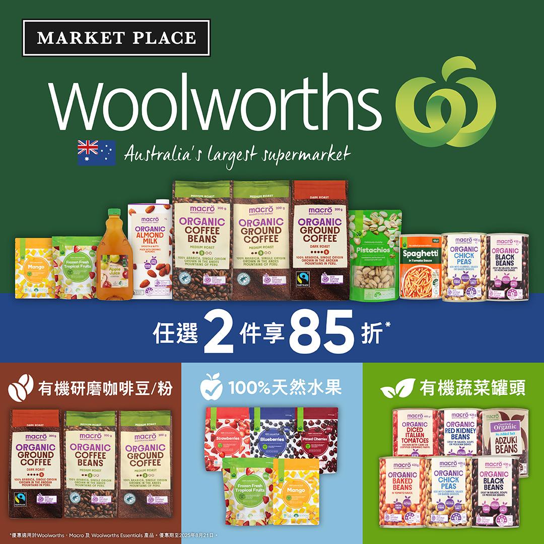 由即日起至8月21日,顧客於Market Place任選2件 Woolworths產品,即享85折優惠。