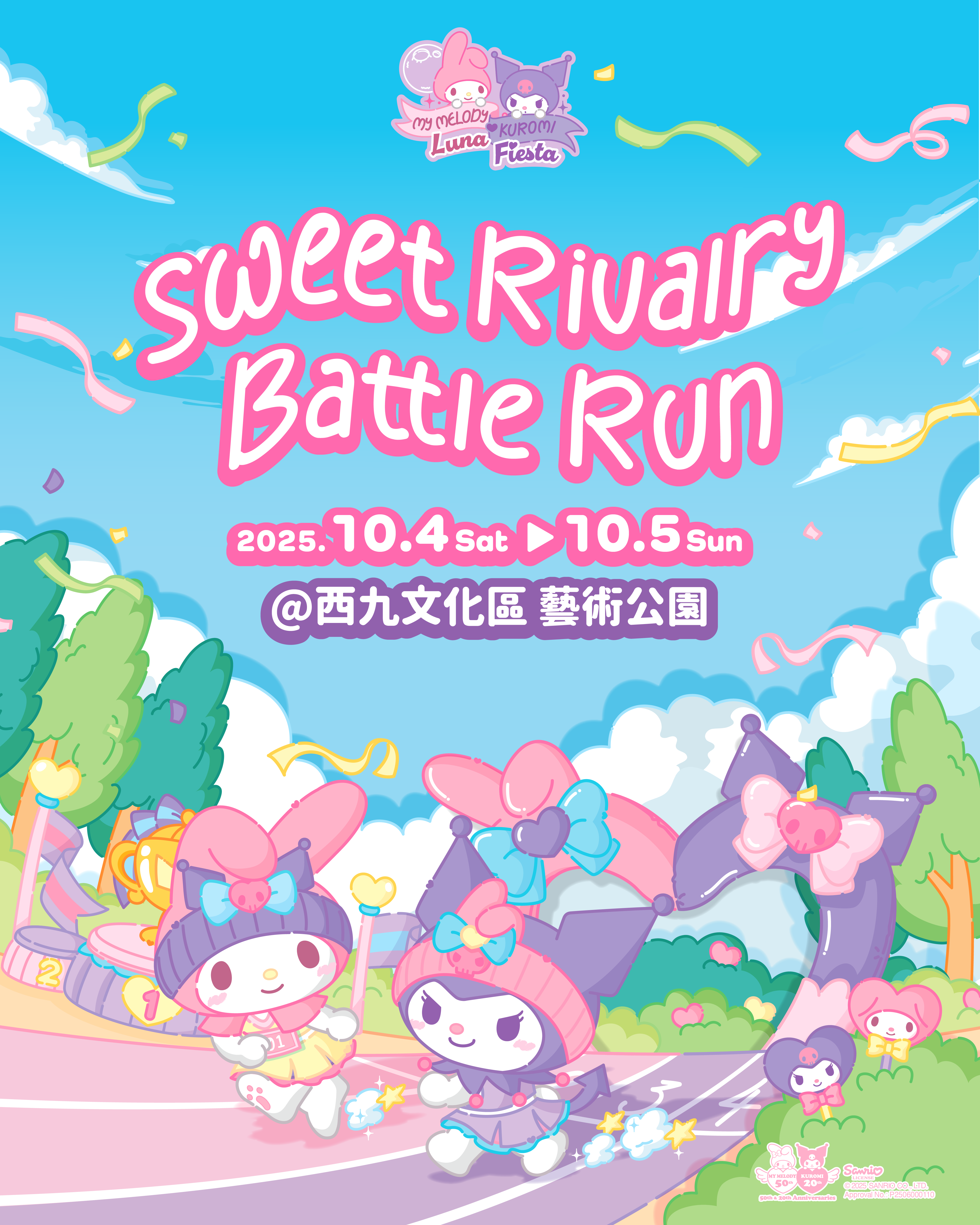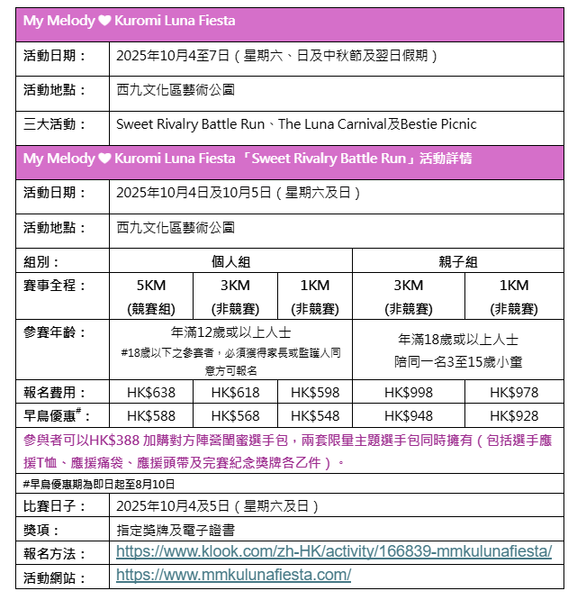 「My Melody ❤ Kuromi Luna Fiesta」將於10月4至7日中秋假期在西九文化區藝術公園舉行,盛典設有3大活動,包括「Sweet Rivalry Battle Run」、「The Luna Carnival」及「Bestie Picnic」。當中「Sweet Rivalry Battle Run」搶先登場。跑步盛會設多種賽程,分別有5KM、3KM及1KM,3KM與1KM賽程更可以親子名義報名(1名18歲或以上人士及1名3至15歲小童),滿足粉絲不同需求。