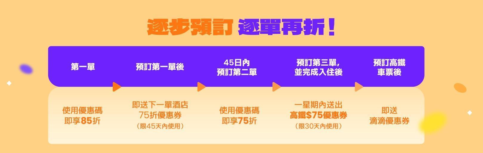 在Klook旅遊平台預訂深圳、珠海或廣州指定酒店,可參加「愈訂愈多折」活動!首單使用優惠碼即享85折,而且即獲下一單預訂的75折酒店優惠券,完成第三單入住後一週內再送$75高鐵優惠券。累計三單最高可省超過$1000,輕鬆享受超值住宿體驗!