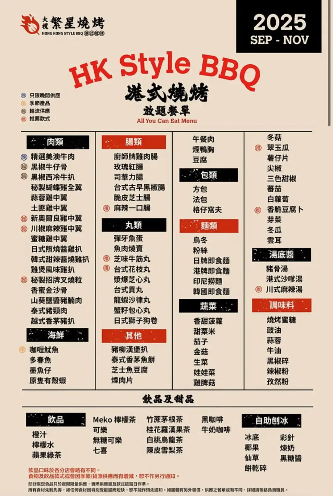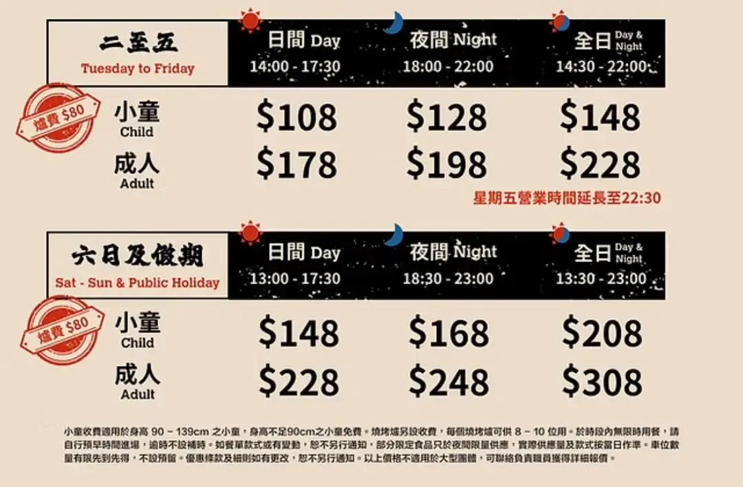 佔地逾萬平方呎,提供港式燒烤、海鮮燒烤及串燒兩款套餐選擇。可選全日任食或分時段燒烤,全日任食可品嚐逾40款食材。包括特色海鮮如大頭蝦、大連活鮑、北海道大扇貝等。成人價$178起(公眾假期$228起)。泊車收費合理:時段$30,全日$50。