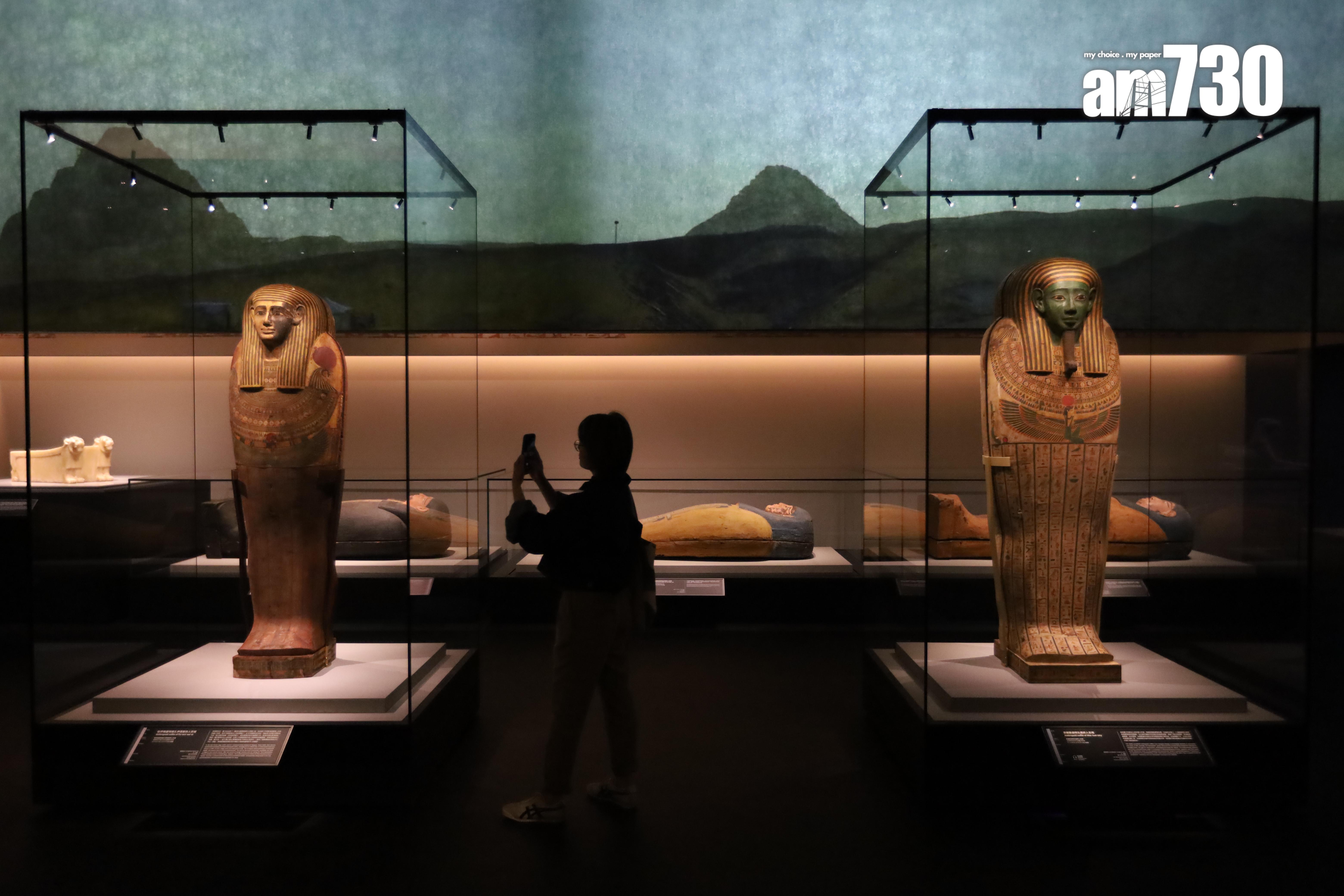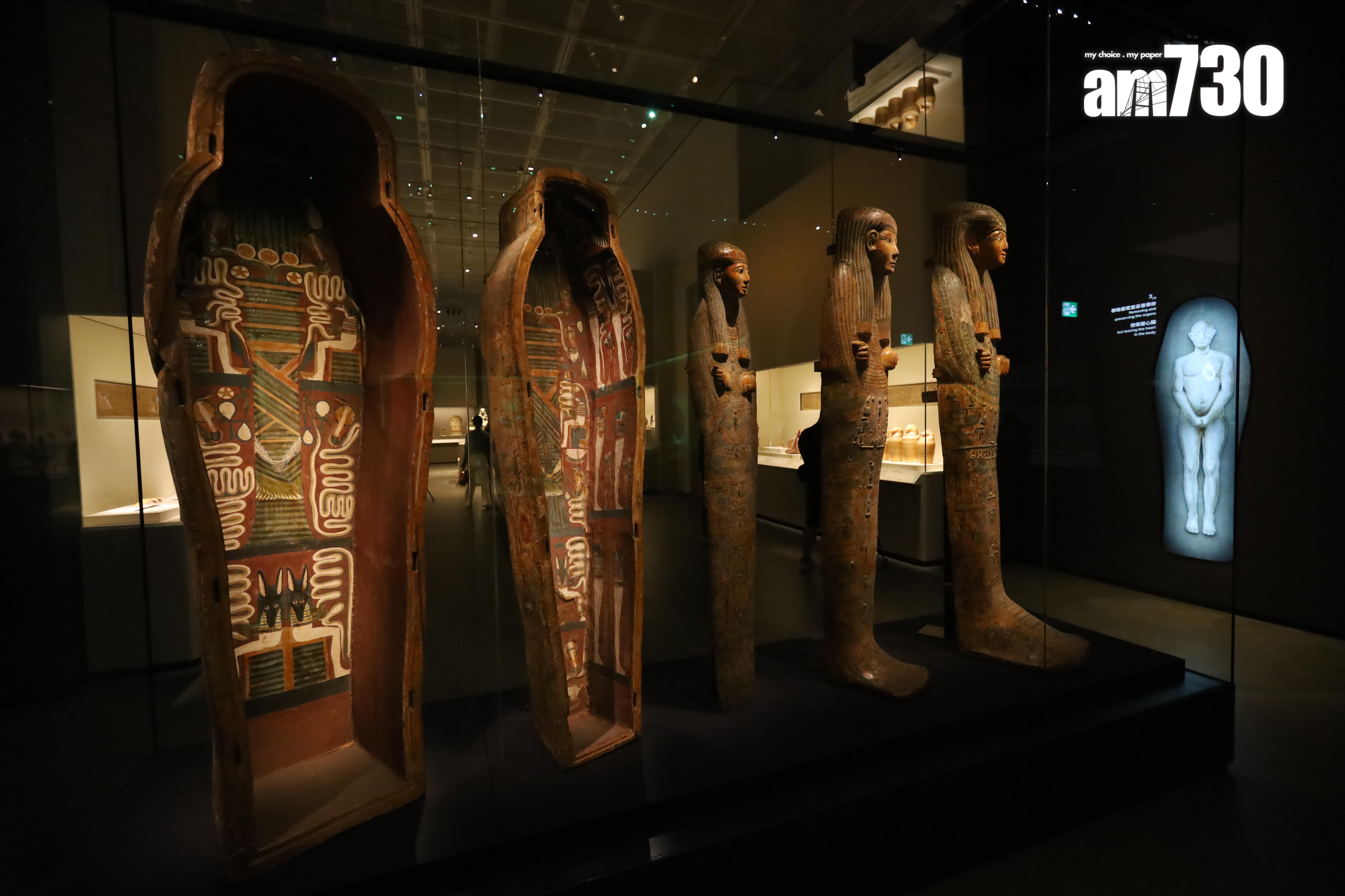 展內展出多款人形棺,人形棺一般用來保存木乃伊,外形仿照死者生前模樣,上面會雕刻不同圖案及文字,幫助死者提供冥界保護及神聖祝福。