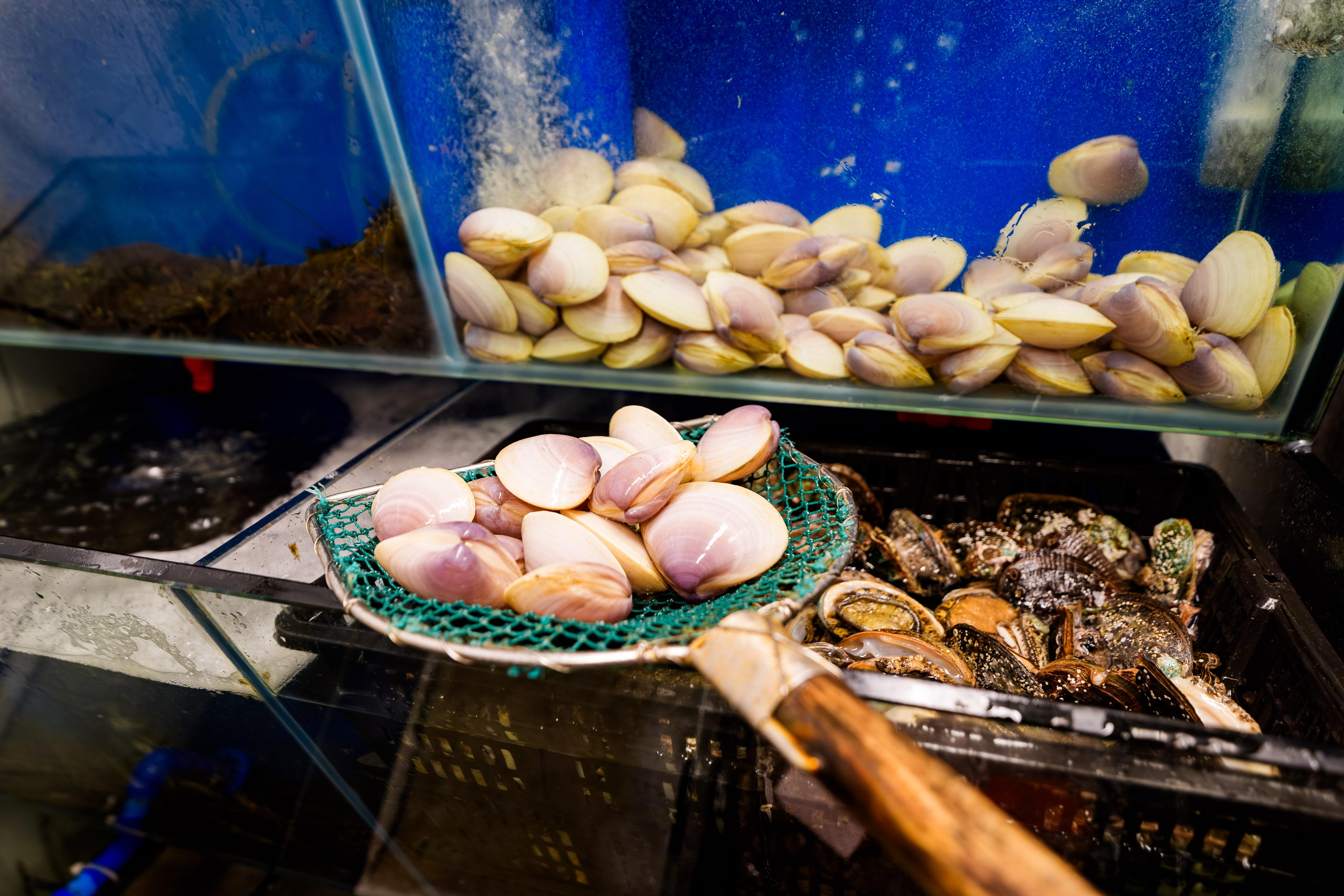 餐廳廚房設有專屬海鮮缸,飼養著生猛活蜆、鮑魚及海蝦。