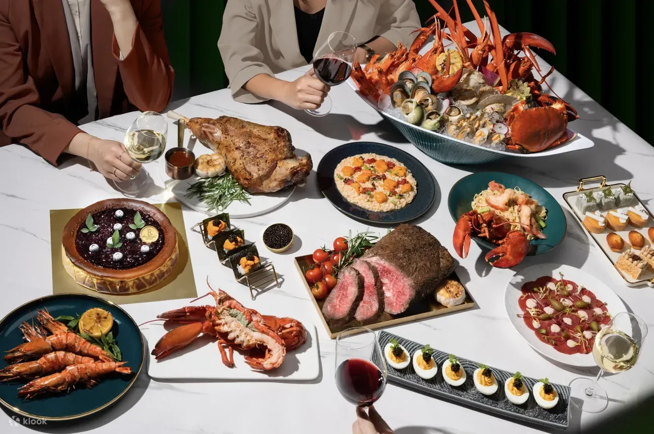 汇聚了多款矜贵海鲜,包括无限供应的冻波士顿龙虾、鲜甜饱满的皇帝蟹脚及肉质丰腴的面包蟹,尽显节日的豪华气派。更有圣诞节期间限定登场的香烤美国圣诞肉眼,以及传统风味的烧火鸡,搭配栗子馅料与蔓越莓酱,将节日的经典风味完美重现。