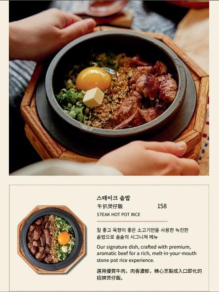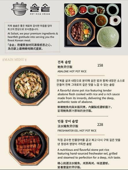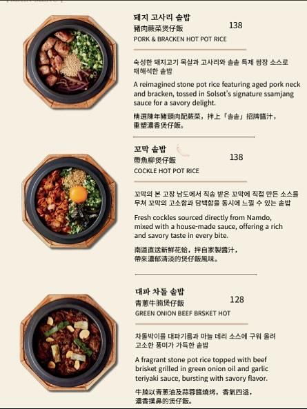 Solsot 一直主打多款韓式釜飯,包括 牛扒釜飯、鮑魚釜飯、鰻魚釜飯,以及鯛魚帶子釜飯等,選用新鮮食材配搭香脆鍋巴米飯,賣相與份量兼備。食用時可先拌勻米飯與配料享用,再把熱湯倒入釜中焗製,最後品嚐香脆又帶米香的鍋巴湯,層次分明。