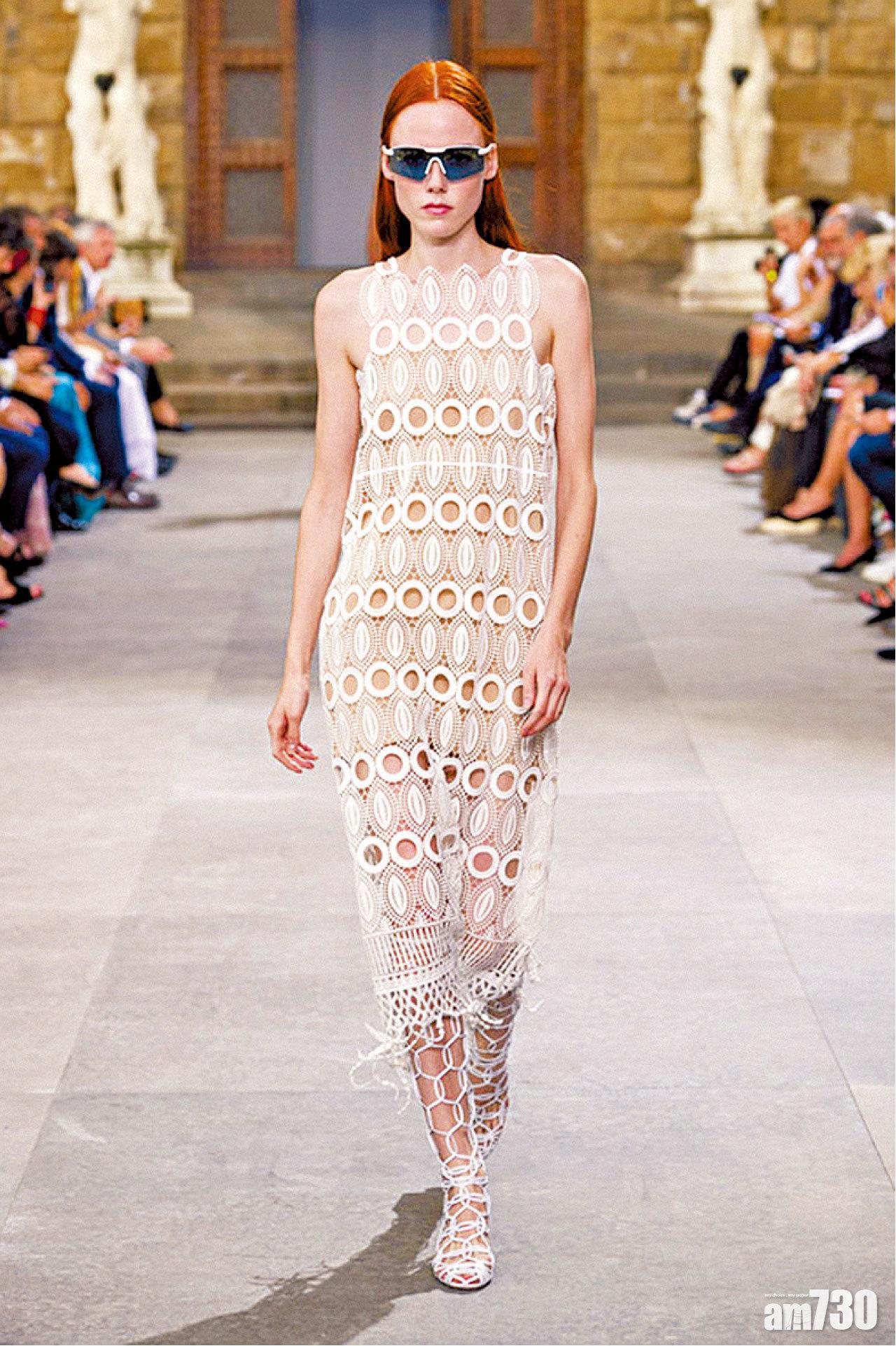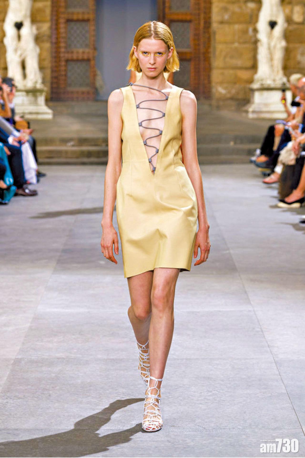 同步亮相的女裝以細膩繁複的編織技藝與刺繡工藝展現人前,多款用上圓形鏤空喱士元素,營造性感,並利用粉紫色、皮革、條紋呼應本季男裝元素。