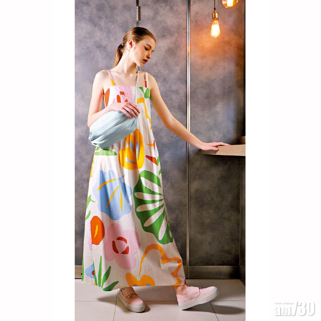 花卉連身裙色調搶眼,充滿春日感。$3,795 手袋 $2,695 厚底布鞋 $1,495