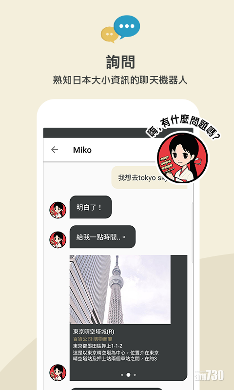 最近Microsoft聯同日本旅行社JTB公司及導航公司NAVITIME Co.,更新了支援繁體中文的Miko AI聊天機器人,能與港人旅客即時互動,為他們的日本旅程作導航。此外,程式擁有圖像識別功能,能透過手機所拍攝的照片,為用家提供資訊。