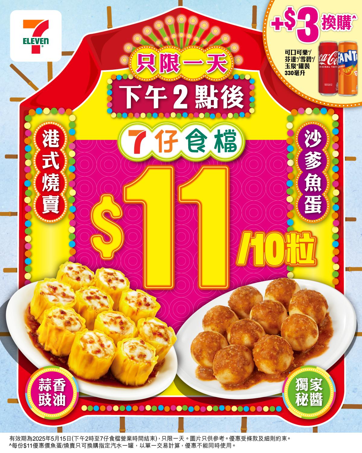 7仔快閃優惠$11蚊10粒燒賣/魚蛋 限時一日!$3加購汽水