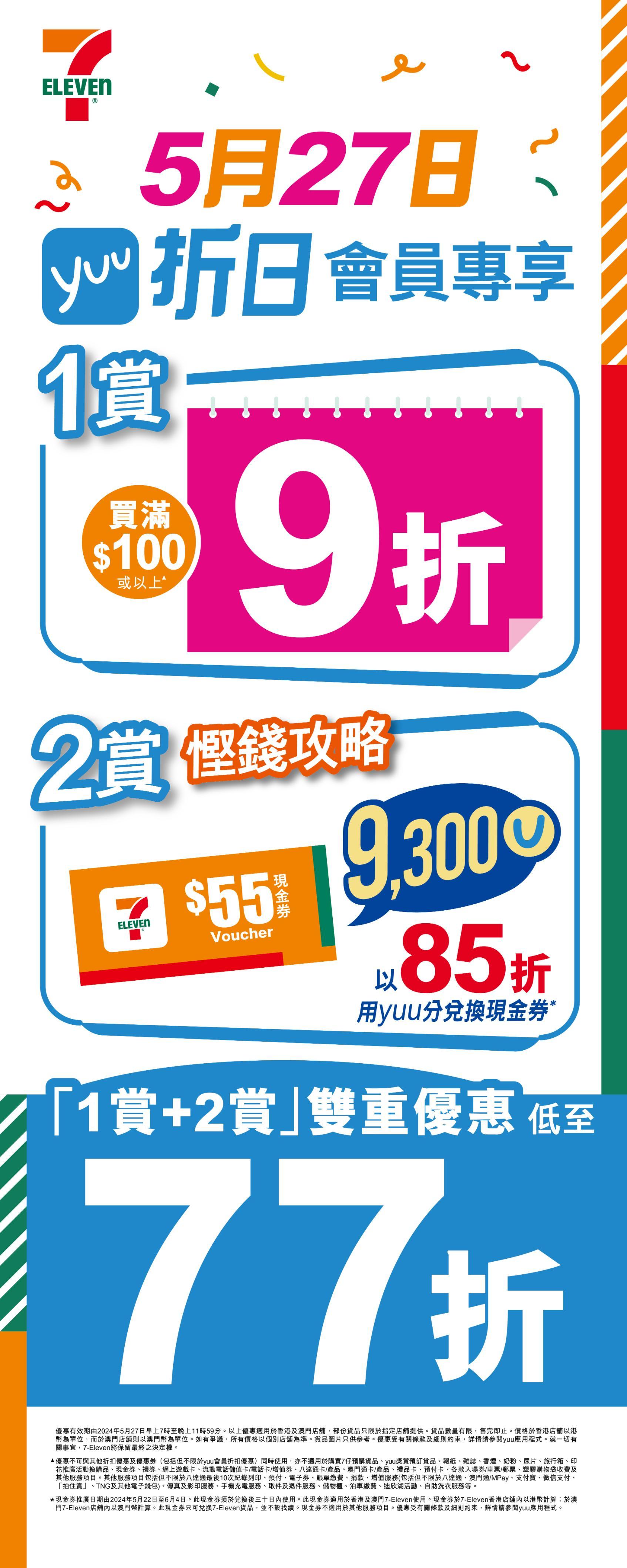 2賞:在5月27日「yuu 折日」當天,yuu 會員若以18,600 yuu積分兌換7-Eleven $55電子現金券2張 (9,300積分兌換7-Eleven $55電子現金券1張);雙重優惠 (1賞 + 2賞) 低至77折震撼折扣優惠!