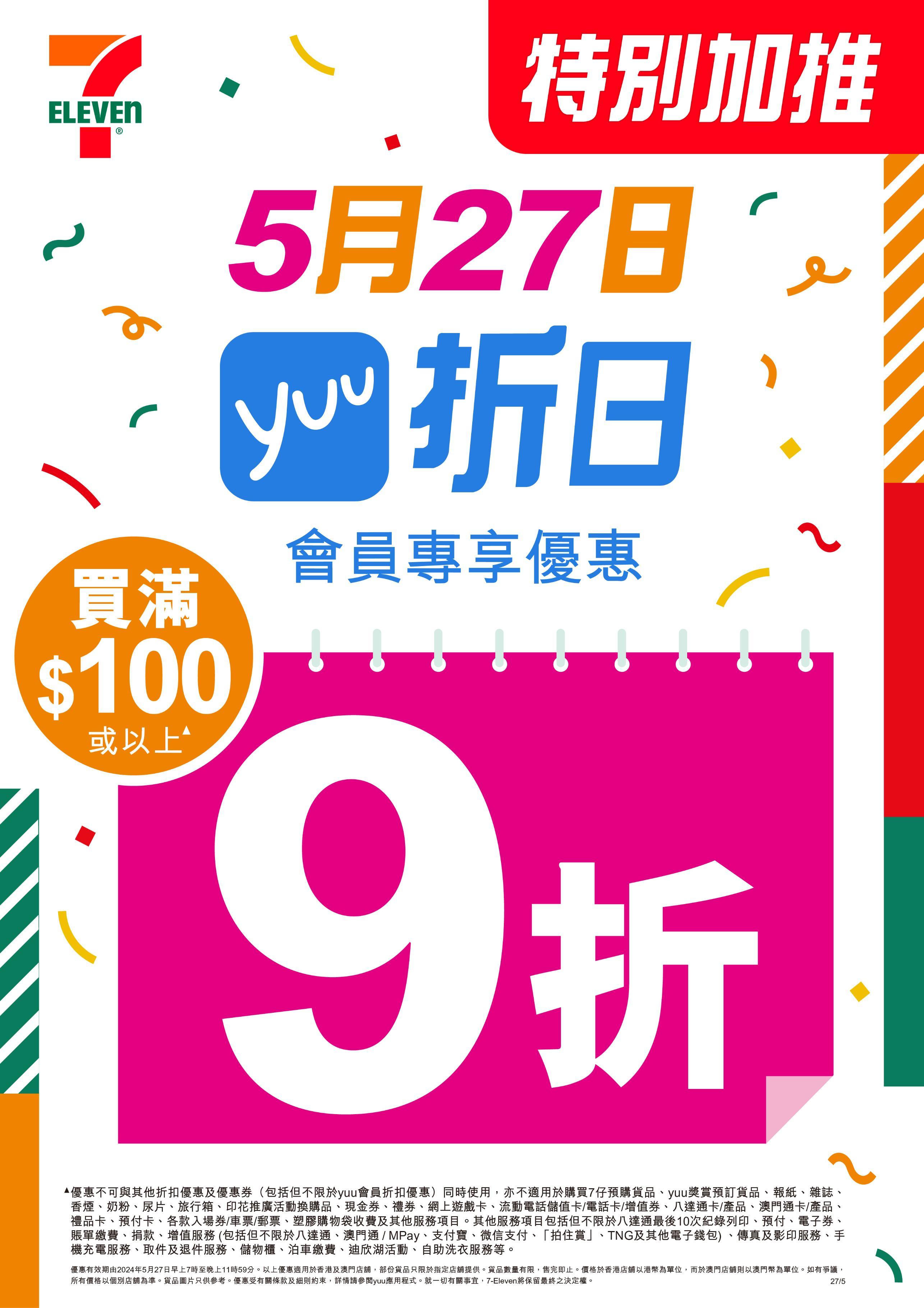 7-Eleven在5月27日舉行「 yuu 折日」,yuu會員只要於當日早上7時起到任何一間7-Eleven購物滿 $100或以上即享有9折大優惠,想以更精明方法掃盡好貨,更可用yuu積分,以優惠率兌換7-Eleven 電子現金券付款,最高可慳高達15%積分,雙重優惠更可低至77折!