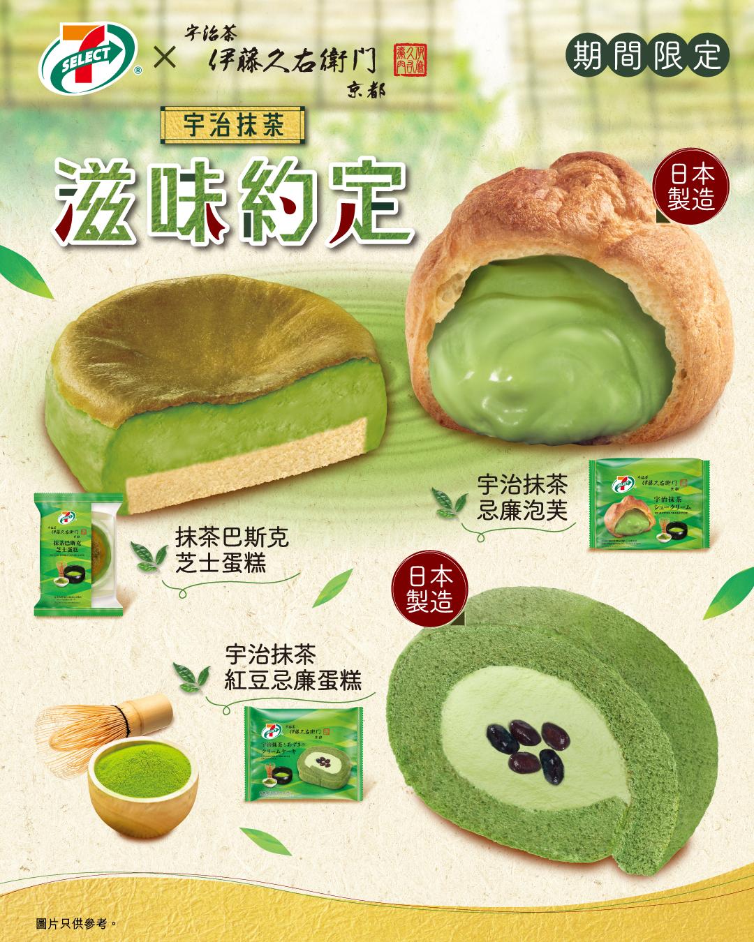 7-SELECT x 伊藤久右衛門「宇治抹茶滋味約定」期間限定系列即日起發售,整個系列均以宇治抹茶為主題, 8款7-SELECT x 伊藤久右衛門甜品及烘焙品,包括宇治抹茶紅豆忌廉蛋糕、宇治抹茶忌廉紅豆銅鑼燒、抹茶巴斯克芝士蛋糕、抹茶吉士忌廉法式車輪酥,宇治抹茶紅豆忌廉瑞士卷、日式抹茶紅豆夾心蒸蛋糕、抹茶吉士忌廉蜜瓜包及宇治抹茶忌廉泡芙。系列選用伊藤久右衛門宇治抹茶粉,每口都充滿香濃回甘的滋味!