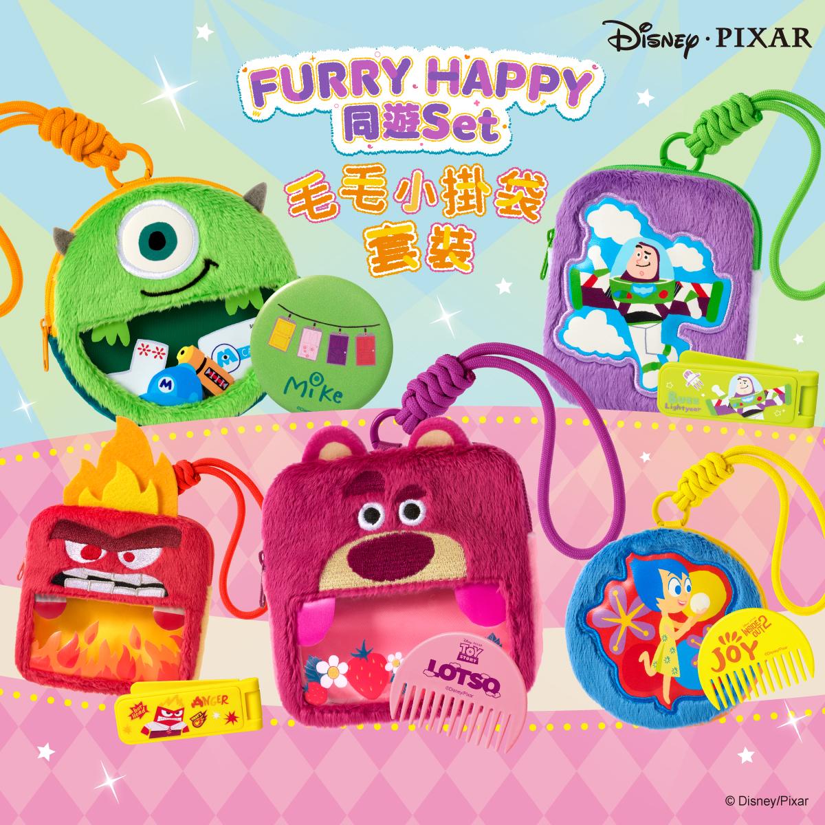 「毛毛小掛袋套裝」以三套迪士尼及彼思經典電影為藍本,包括《玩轉腦朋友》、《怪獸大學》和《反斗奇兵》的人氣角色Joy (阿樂)、Sadness (阿愁)、Anger (阿燥)、Disgust (阿憎)、Mike (大眼仔)、Sulley (毛毛)、Buzz Lightyear (巴斯光年)、Lotso (勞蘇)、Alien (三眼仔)、Woody (胡迪)。每套均有毛毛小掛袋及同款隨身小物各一件,隨身小物分別有4個款式,包括「隨身鏡」、「衣物除毛刷」、「隨身梳」以及「眼鏡布」,體積小巧,攜帶方便,更印有角色名字或標誌性圖案等,設計別具心思,CP非常高!