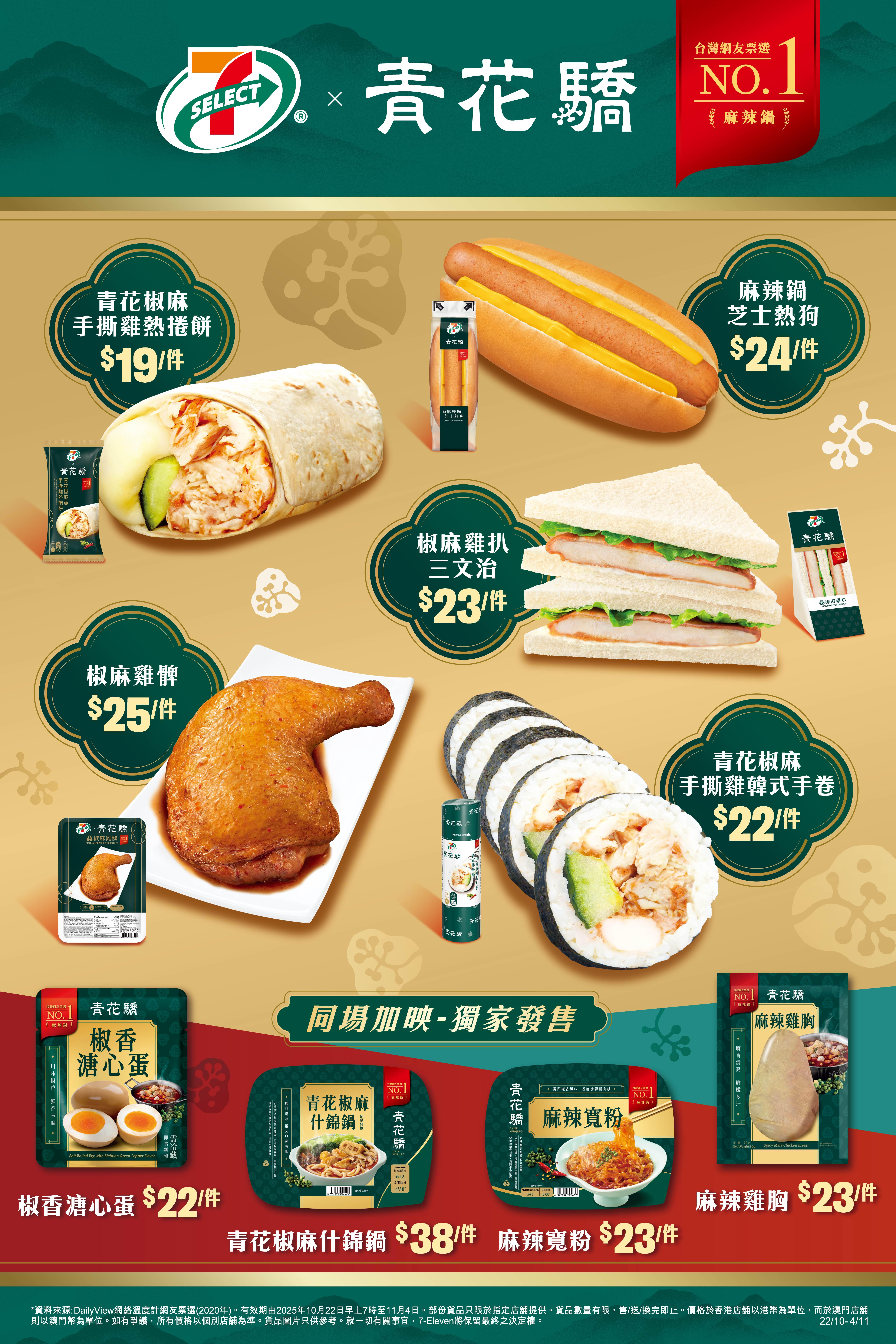 7-SELECT 與「青花驕」首次聯乘,以馳名麻辣椒香為靈感,合力打造5款期間限定輕食包括:7-SELECT x 青花驕青花椒麻手撕雞熱捲餅、7-SELECT X 青花驕青花椒麻手撕雞韓式手卷、7-SELECT x 青花驕椒麻雞髀、7-SELECT x 青花驕椒麻雞扒三文治及7-SELECT x 青花驕麻辣鍋芝士熱狗,款款都融合了青花驕招牌麻辣鮮香,喜歡椒麻口味就絕不能錯過。