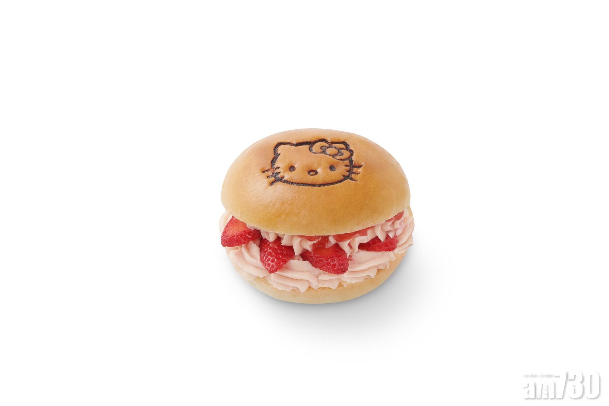 Hello Kitty甜心漢堡,鬆軟麵包配襯別緻Hello Kitty圖案,加上甜酸多汁士多啤梨搭配士多啤梨芝士忌廉。$19/只限美心現場烘焙店有售