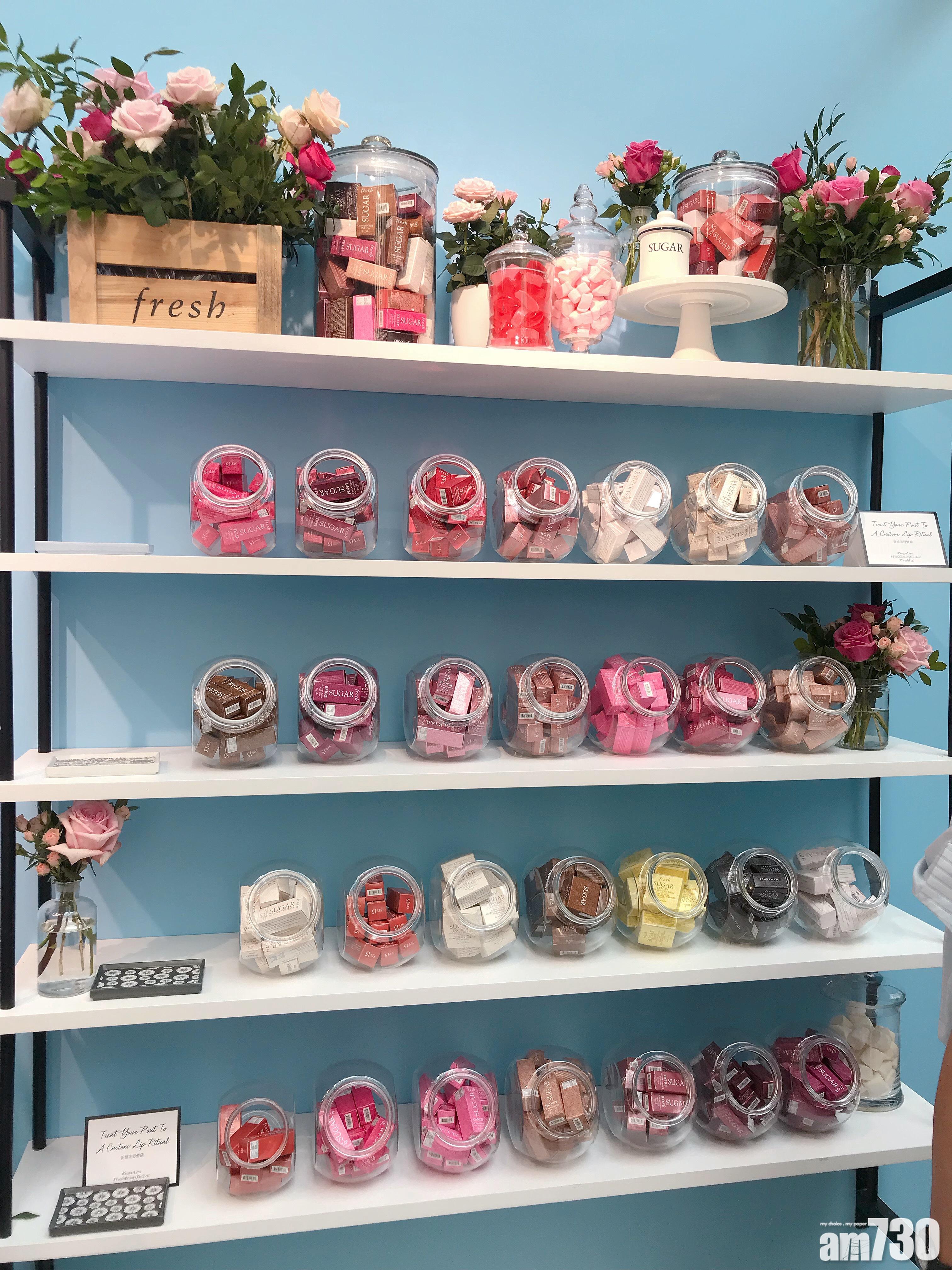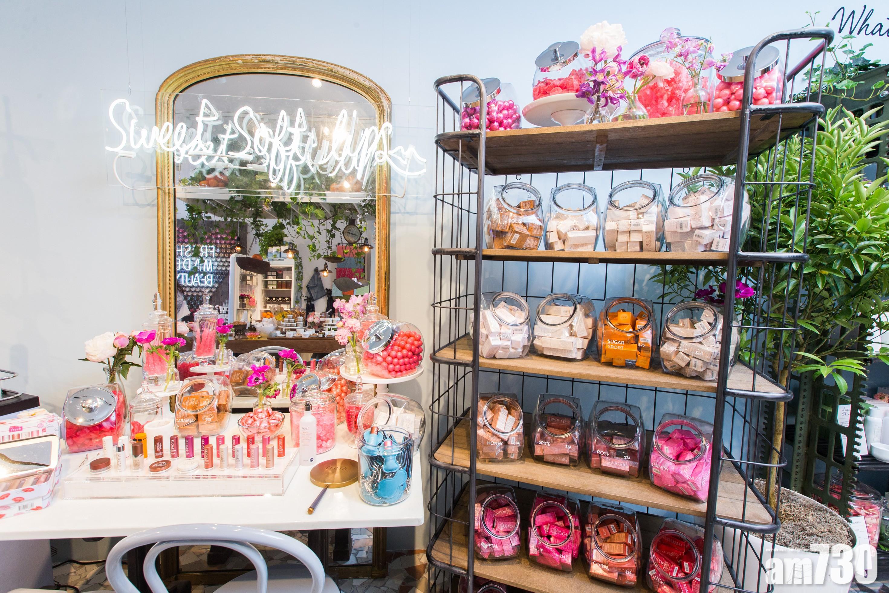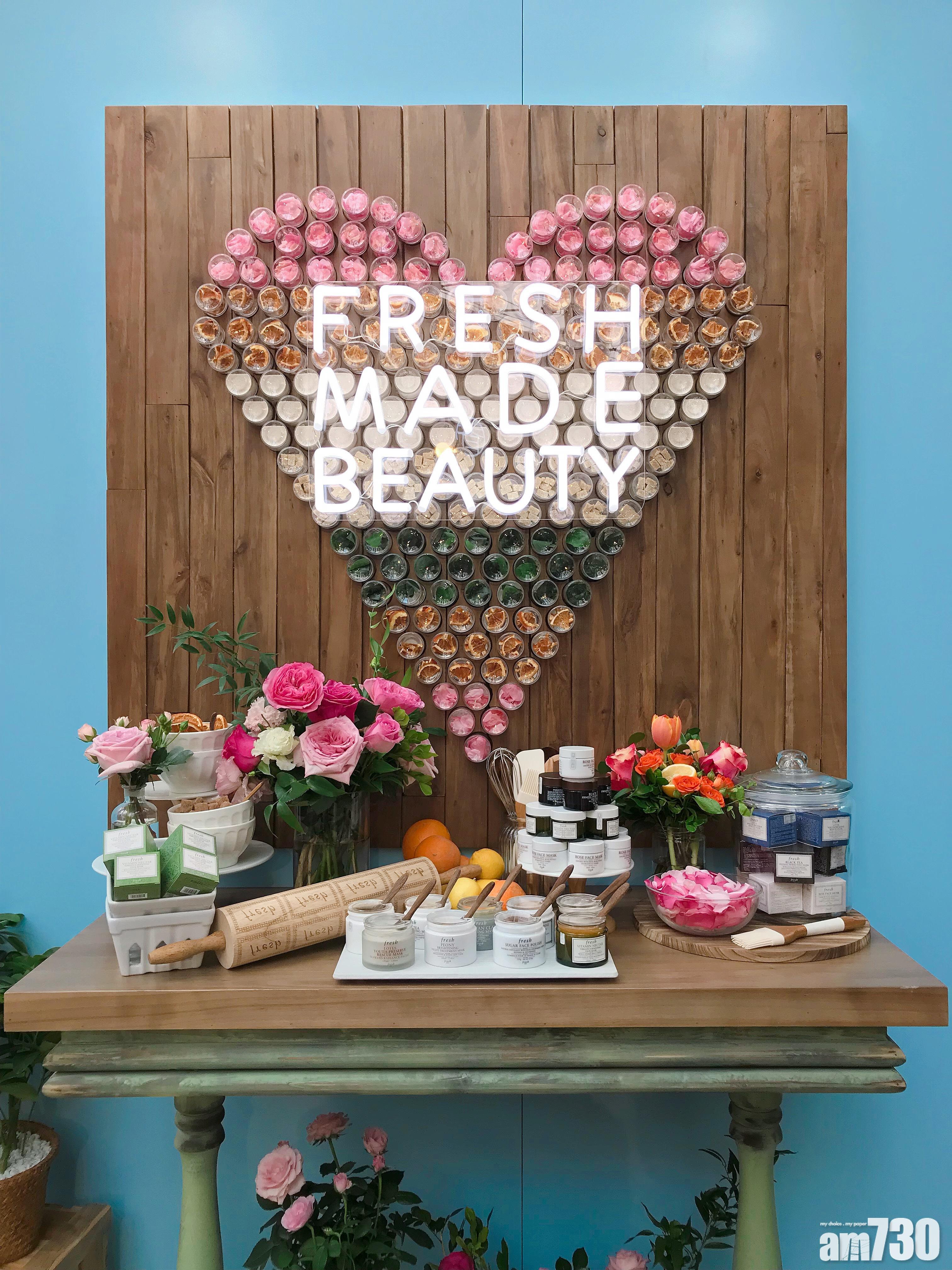 香港店的風格與紐約相約,一入門便可見到心型掛飾(影相位!),由數十瓶天然食材組合而成,包括玫瑰、橙片、意大利白泥、紅茶、黃糖等,全部都是Fresh面膜的主要成分。