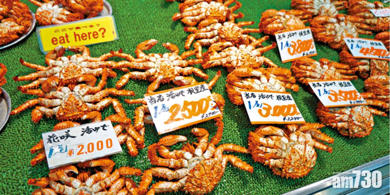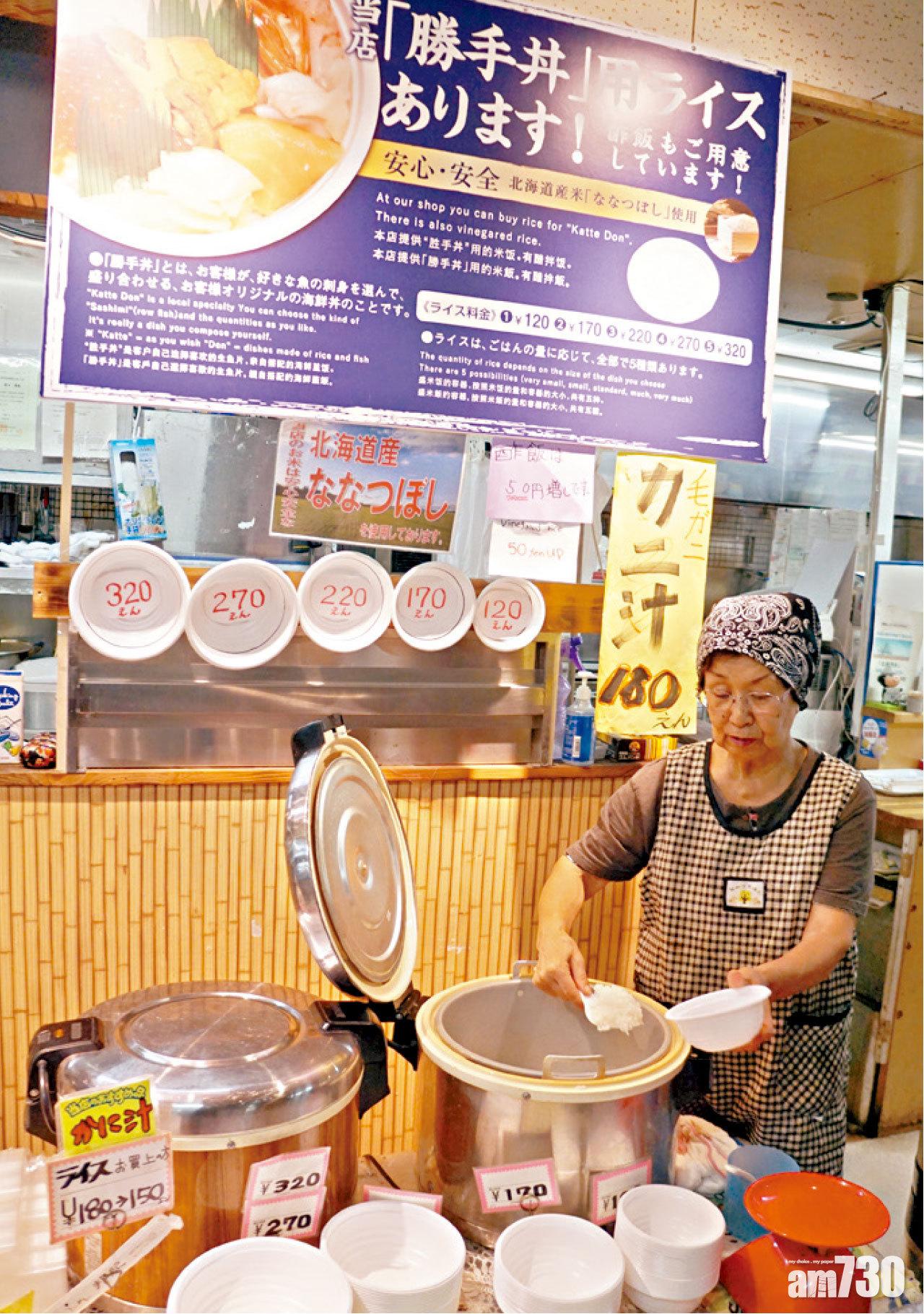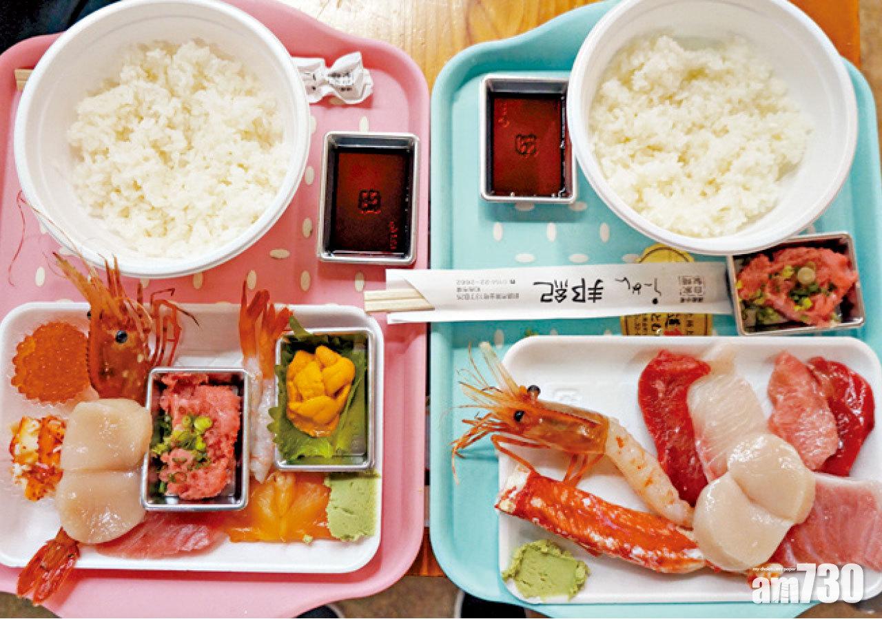 魚生、鮮蝦、海膽、貝類,甚至皇帝蟹腳,整齊排在開放式雪櫃,顏色繽紛,明碼實價,按件數或重量計算。我和同伴有點瘋狂,揀少飯但多餸,兩人合共6,500日圓(約450港元),高級版車仔飯。