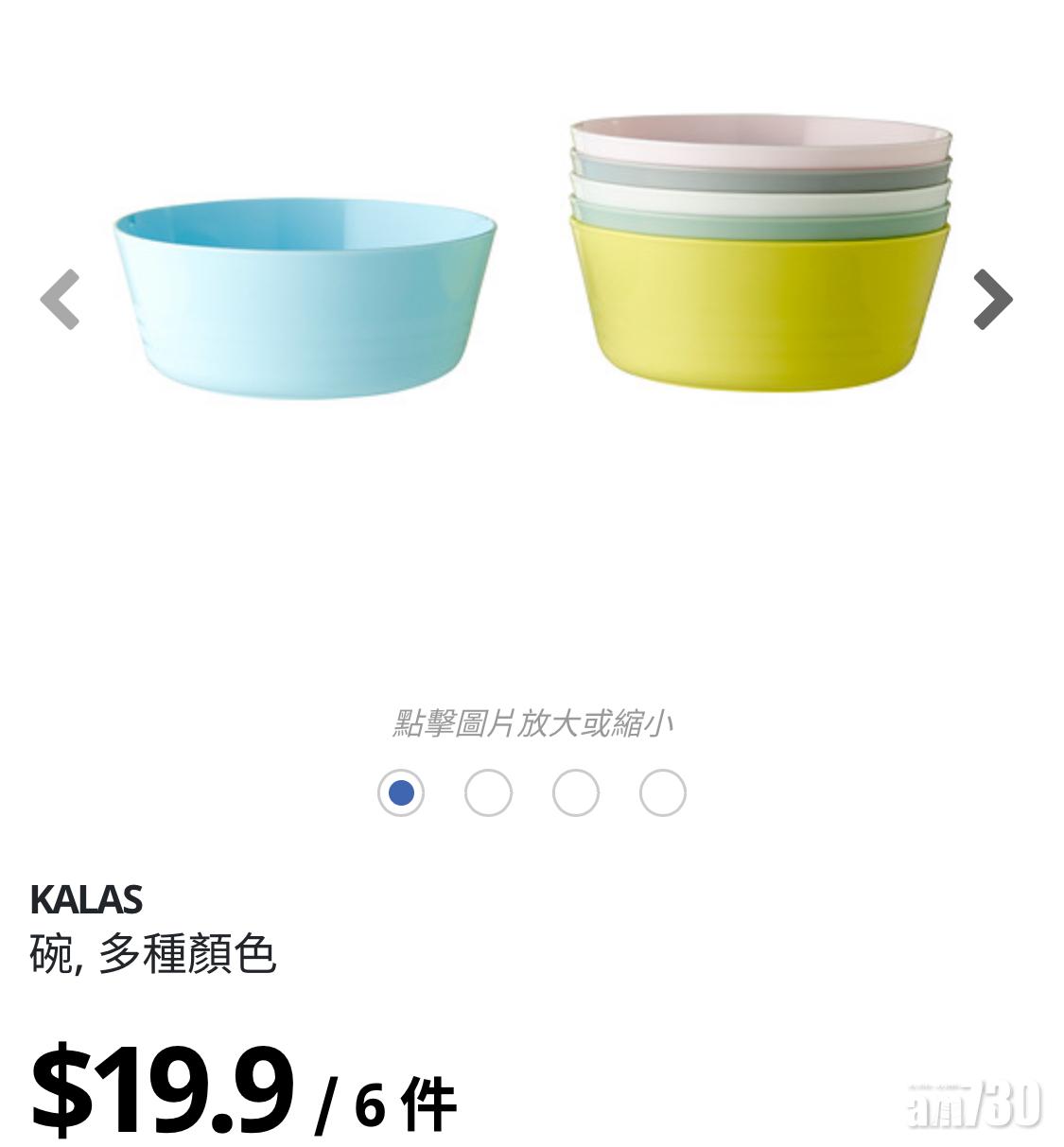 KALAS系列的餐具顏色鮮艷,大部分只需HKD$20就有6件,而且碗、杯等可疊起,有助節省收納空間,不少人都會購買於派對時使用。可惜它的價錢雖然低廉,但其塑膠質料在沾上油後特別難清洗,以洗潔精清洗後亦總會有一層油膩的質感,需要花更多時間才能變回原形,因此並不建議購買。