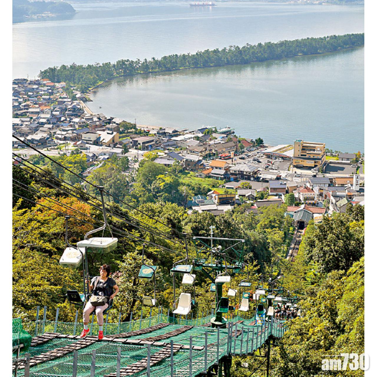 「天橋立」位於京都府北部的丹後半島,面朝宮津灣,從大阪出發車程幾近3小時,但遊客絡繹不絕。天橋立有四大觀賞位置,不同位置的沙洲景色各異,當中最著名的是,座落天橋立北側海拔130米山腰的「傘松公園」,是眺望天橋立的絕佳位置,旅客需乘搭吊椅登山,座椅全無遮蔽,雙腳懸空,畏高者覺得可怕,但視野極佳。