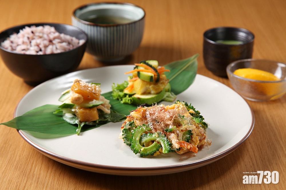 Café & Meal Muji繼春季帶來沖繩料理後,在炎炎夏日延續這份健康,利用多種食材及新鮮蔬果補充身體流失的汗水和電解質,水果入饌更打造fresh感覺,至於餐後的甜品及輕食選擇亦非常豐富。沖繩料理套餐除了一貫的水雲豆腐湯、苦瓜款式由配搭菠蘿轉變為加入豆腐炒蛋,配以家常調味料如沖繩盛酒、黑醋、醬油及木魚絲,味道豐富;更有沖繩料理中不可或缺的昆布,製作出新鮮感十足的墨魚昆布炸餅;而經常轉換口味的冷熱盤,有乳酪菠蘿雞肉沙律、椰菜花蝦肉沙律及烤鯖魚配芒果芥末醬汁等,以水果天然甜品帶出肉類的鮮味,寧舍開胃。圖(部分)、文:Winki