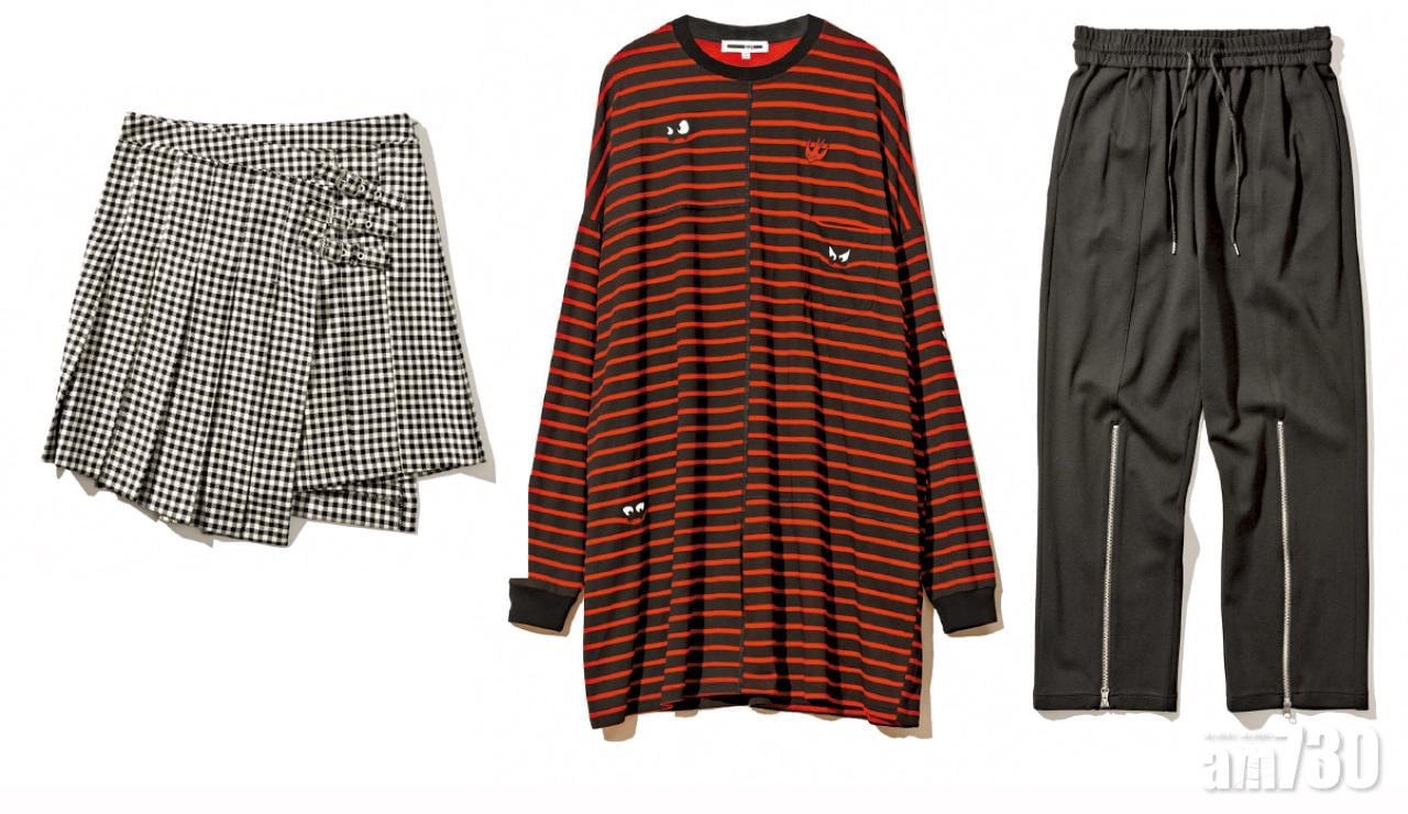 [左至右]  黑白格仔skirt $4,799(E)/紅黑橫間oversized knit top $3,399(E)/黑色sweatpants $4,599(E)